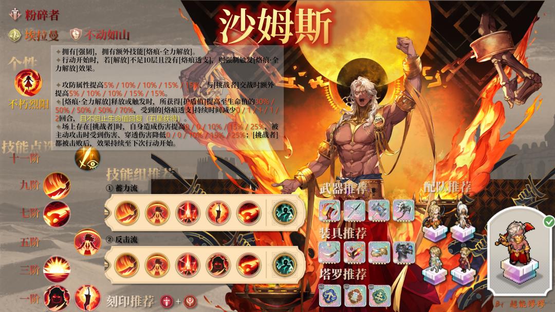 沙姆斯是擅长与敌人对决的粉碎者战士,能通过透支自身生命获得更多的[解放]和护盾,进行猛烈进攻。 他在准备后可以对目标造成高额伤害,或是对敌人进行角斗,使挑战他的对手受到强力的反击。 通过技能的搭配可以灵活切入战场造成减益,或使自身跳过准备全力输出。 角色一图流 一、面板解析 阵营:埃拉曼、不动如山 基础物攻值:1591,全角色排名第10,在粉碎者中排名第2,仅次于卡姆洛特; 基础物防值:661,全