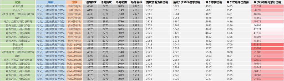 本文将从数据的角度告诉你,对于伊瑟琳德而言,在一般的场景下,武器和塔罗应该如何选择,才能使得输出最大化。 测试变量 参与测试的伊瑟琳德天赋、羁绊、星级、阶级均为满级,进图前魔攻、物攻、物防和生命值均相同,携带的技能组为可造成单回合高爆发伤害的技能组: 根据不同武器、装具和塔罗,分为以下18组配装方案: ① 新生之刃+专武+死神 ② 长夜流光+专武+死神 ③ 守护决意,且提前套盾+专武+死神 ④ 曙
