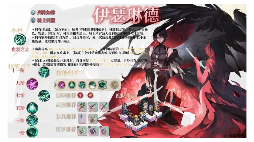 伊瑟琳德简评 玩家习惯攻伤爆的即时高爆发,穿透伤害总是低人一头,持续伤害就更卑微了。这样还用内置CD限制她的大招,实在岂有此理! 所以,玩伊瑟琳德该将目光放在高超的 团队机动 和 生存力 上。 伊瑟琳德第一回合就可以放置3枚个性【血羽之刃】。外加抉择技传送队友,可帮助4名队友快速跑图接近敌人。【偏斜】+【冰铠·改】能避免队友过于深入导致伤亡。 如果敌人就在近处,还可以开大招多放2枚,帮助队友二段跑