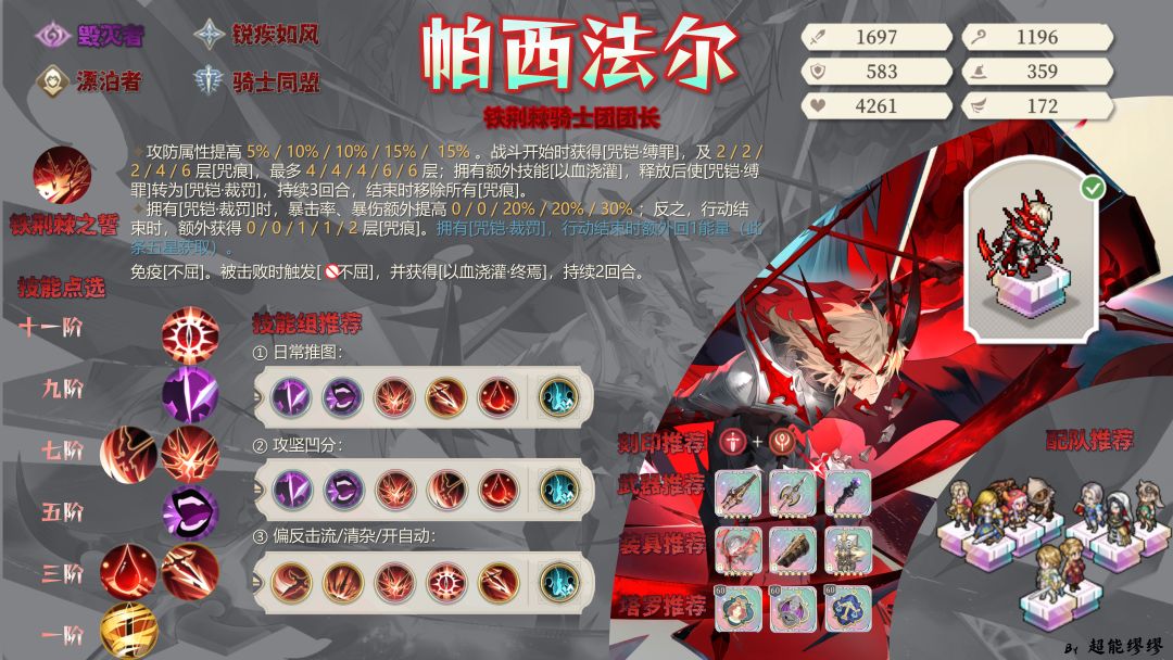 「帕西法尔」是一名擅长持续范围伤害的毁灭者纯输出角色,有“缚罪”与“裁罚”两种状态。在“缚罪”状态下,帕西法尔能在行动开始时将周围友军的属性减益转移至自身,并于行动结束时获得“咒痕”;使用个性技能“以血浇灌”后,帕西法尔进入“裁罚”状态,输出能力大幅提升,并获得驱散、生命汲取和物理护盾等多重效果,期间攻击或反击时会消耗“咒痕”,“咒痕”耗尽则退回“缚罪”状态。详细测评如下: 角色一图流: 一、面板