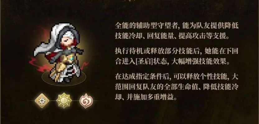 「柯莱丹萨」是一名全能的辅助型守望者,能为队友提供降低技能冷却、回复能量、提高攻击等支援。执行待机或释放部分技能后,她能在下回合进入[圣启]状态,大幅增强技能效果。在达成指定条件后,可以释放个性技能,大范围回复队友的全部生命值、降低技能冷却、驱散全部减益并施加多重增益。以下是详细测评: 角色一图流 一、面板解析 基础魔攻值:1403,在全部角色中排名19,在守望者中排名第二。在辅助中高于伊南娜、塔