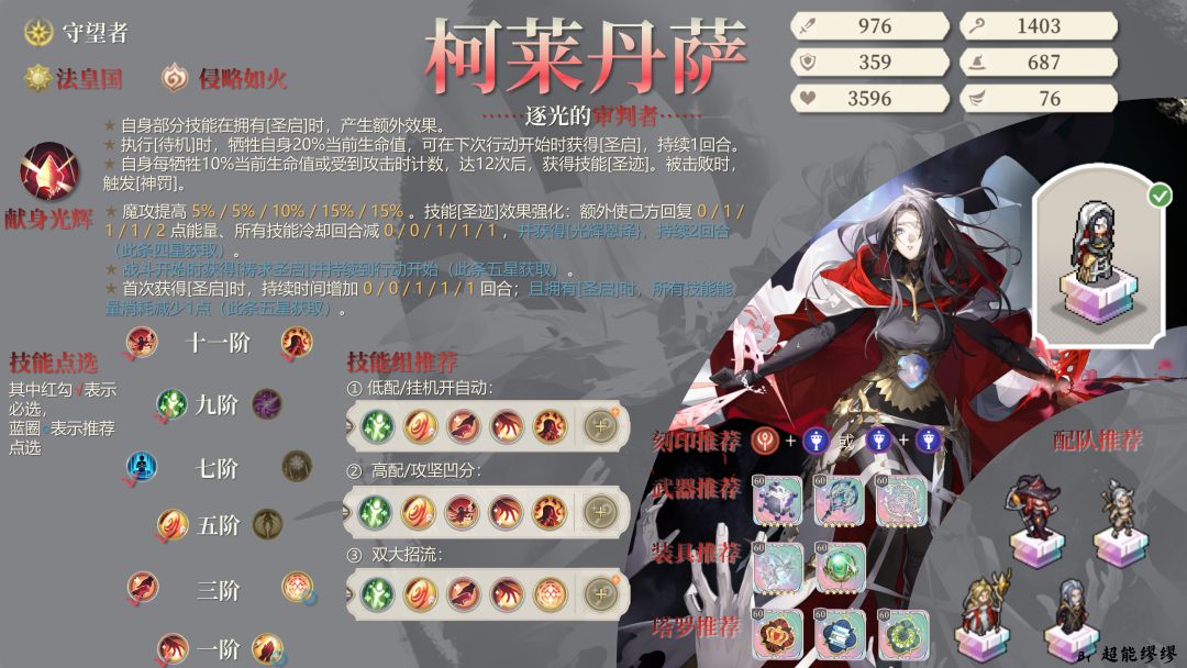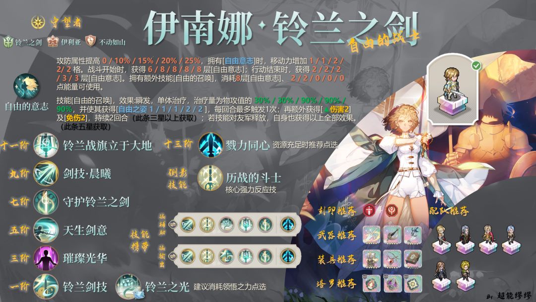 一句话总结含金量。 守望者,5格移动力,有大光环,能让自己和一个友军再动,很高的魔法范围伤害,坦度也不低,综合实力很强。 如果你还在用伊利亚或铃兰之剑阵营的角色,这角色就肯定要抽的。 一、技能加点 简单点说,全点左边。 1阶右边的“铃兰之光”,前期基本不带,后期要交领悟之力。(5星后有大用,看我另一个帖子) 7阶右边的“让我们携手共进”,效果和11阶的战旗效果重复,范围只有两格,基本不会带。 11