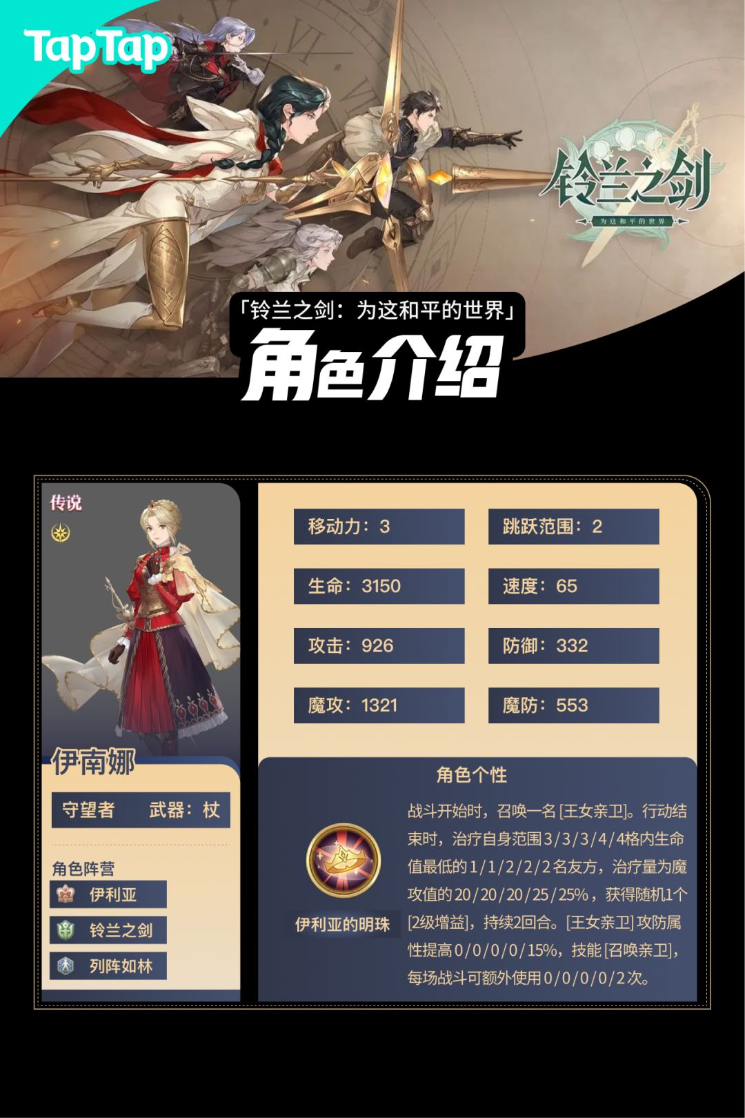 角色一图流 一、面板数值 职业:王女亲卫 职能类型:防御者 移动:3 阵营:伊利亚、不动如山 面板数值:(以60级、13阶、五星的满级预览为例) 物理攻击:1599 魔法攻击:1083 物理防御:485 魔法防御:511 最大生命:3576 速度:222 二、个性解析 1. 逐级个性: 造成的[物理伤害]视为[魔法伤害]。战斗开始时获得技能[皎月照拂]。对3格内具有[誓约的友军进行[援护防御]。自