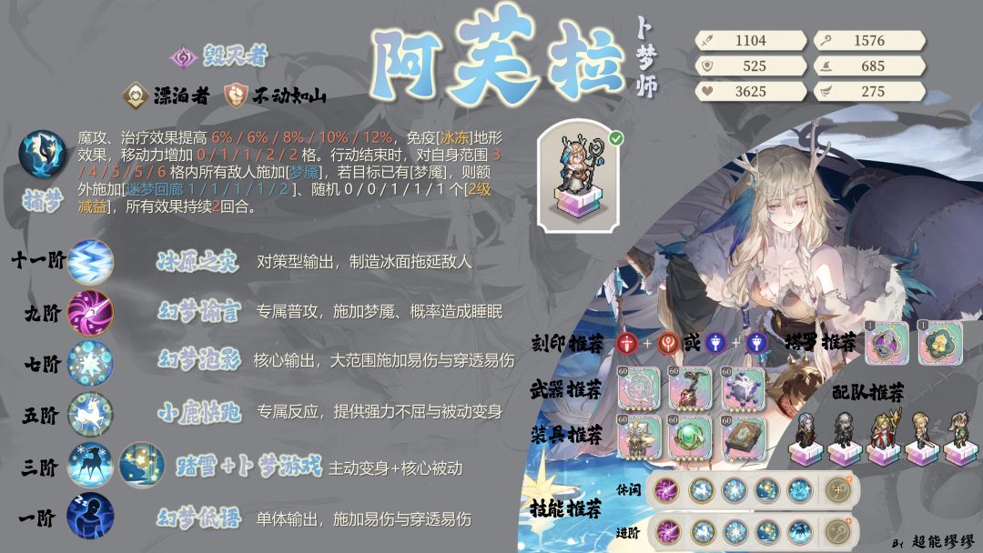 角色一图流 一、面板数值 职业:卜梦师 职能类型:毁灭者 移动:3 阵营:漂泊者、不动如山 面板数值:(以60级、13阶、五星的满级预览为例) 物理攻击:1104 魔法攻击:1576 物理防御:525 魔法防御:685 最大生命:3625 速度:275 二、个性解析 1. 逐级个性: 魔攻、治疗效果提高 6% / 6% / 8% / 10% / 12%,免疫[冰冻]地形效果,移动力增加 0 / 1