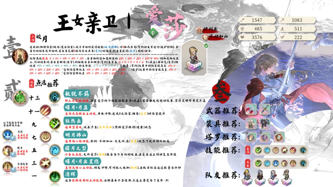 角色一图流 一、面板数值 职业:王女亲卫 职能类型:防御者 移动:3 阵营:伊利亚、不动如山 面板数值:(以60级、13阶、五星的满级预览为例) 物理攻击:1599 魔法攻击:1083 物理防御:485 魔法防御:511 最大生命:3576 速度:222 二、个性解析 1. 逐级个性: 造成的[物理伤害]视为[魔法伤害]。战斗开始时获得技能[皎月照拂]。对3格内具有[誓约的友军进行[援护防御]。自