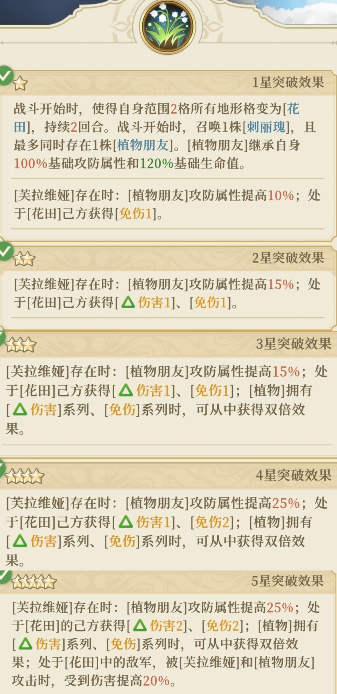 本帖更新时间【2024年11月1日】[表情_开心] 【芙拉维娅-防御者】全技能+全资料解析 【个性技能】 1、开局修改地形+召唤植物。植物集成自己100%属性攻防和120%基础血量。 2、地形提供BUFF,植物享受双倍效果(3星起) 3、花田会被点燃,比如火魔女就可以。 【这是关键的地形技能介绍+植物介绍:注意,一共有3种植物,下文有图[表情_流口水]】 【天生技能】有4种选择: ①buff效果: