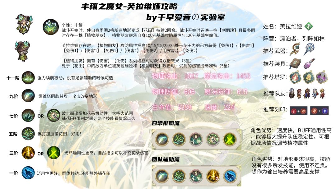 芙拉维娅是一名魔法防御者,其可以通过各种手段将战场变为【花田】与自己的友军和【植物朋友】对敌方进行打击。同时芙拉维娅是一个综合能力还算不错的角色,能够在战场上承担各种职能 角色优势:强大的地形控制能力,还不错的AOE伤害制造能力。强大的妨碍敌方行动,并且能够在队伍中承担各种功能性 角色劣势:过于依赖地形产生互动,缺少瞬发技能会导致手感较为奇怪。如果想作为主输出培养需要比较高的星级。 个性技能 丰穰