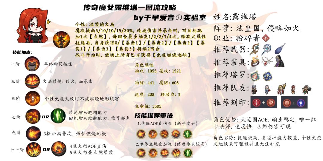 BY 铃兰科研组-千早爱音の实验室 省流一图流: 一、【属性值】 第一位粉碎者法师,魔法攻击力给的相当夸张,比部分毁灭者都要高。超高的白值奠定了其不俗输出的基础。 速度208点,比奥古斯特低1点速度,比霍码低2点速度,配合其技能组有很强大的先手优势。这个速度值是目前输出法师里少数200速度线的。 二、【技能解析】 个性技能:【涅槃的火鸟】 非常简单直观的效果,主要分为三点来讲 1. 加魔攻,进图