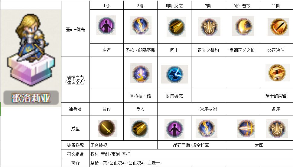 人物攻略 骑士团: 旗妹-抽到血赚-3星加强/5星登顶 伊利亚 王女-抽到血赚-再动奶妈 元帅-抽到血赚-前期打神兵的T0 大王子-抽到不亏 大姐头-抽到不亏(有送就小亏) 盾娘-抽到不亏(4星质变) 挨打-抽到不亏-功能性辅助神1 神3都好用 伦妹-暗弩-抽到不亏-打得神1的妈妈 狐姐-抽到不亏-有妹妹(诺诺)就是神-55级后期成神 茉莉-茉茉-感染核心之三-抽到不亏 教廷 圣女-抽到血赚-第一
