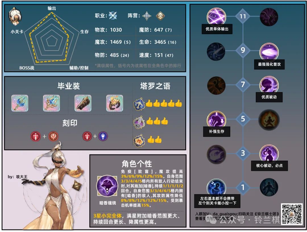 只针对普通玩家,xp党氪佬冲逆塔分的可以忽略。 以下仅是个人观点,欢迎讨论 法刺大家给的定位是法c,如果是新手,没有蓝职我觉得可以抽。如果已经有蓝职了我觉得可以等等。因为这个游戏里最关键的材料资源就是天赋。 蓝职法刺与蓝职物理输出是不一样的,要点的天赋是反的,如果要培养成法c难免会出现资源紧缺。 这是我自己的教训,一开始唯一的光职是席妹,结果后面又多了别的光职,点天赋要平衡会不够。导致现在即便光辉