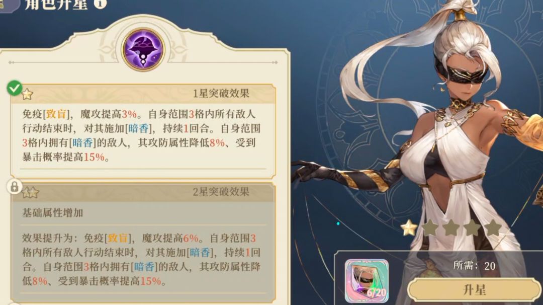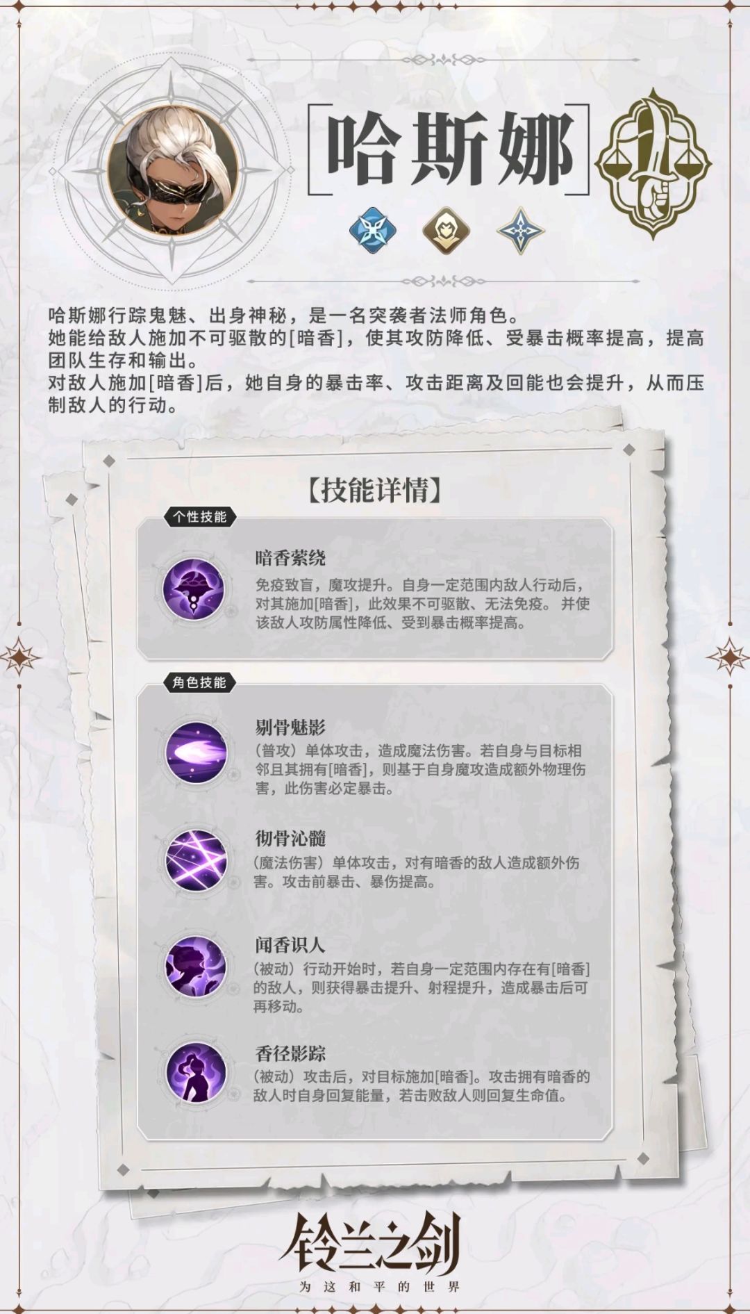 哈斯娜作为三系突袭第一个真正的法术输出手,那么以后的职能不再是单一评测角色的标准了,后面的角色肯定会变得更多样化,使用手法也会各不相同。 个性效果提升较为平缓,参考马格努斯的个性光环提升效果。但哈斯娜比马格努斯多提升了15暴击率,面对单个敌人,暗香很容易持续上,面对多个敌人依靠个性效果很容易断档,只有满星后持续两回合才算稳定,这一点效果不如老马。 香径影踪是哈斯娜的核心被动,依靠这个被动,低星级就