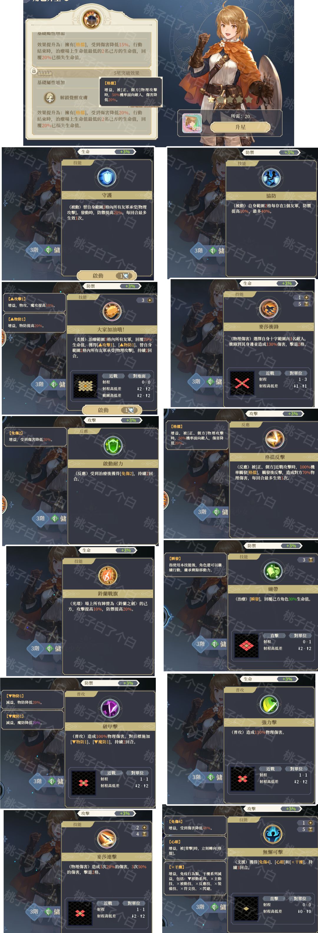 角色定位:奶盾/援护盾 适用场景:阵地战、消耗战。不适合奔袭和复杂地形的战斗。 优点:可以同时承担援护盾和副奶的责任,极大增强阵容生存能力。 缺点:腿短,缺能量,坦度一般。 升星推荐:4星小质变,但升星收益低,不推荐升星。 技能加点:①守护 ②大家加油哦! ③格挡反击 ④绷带/铃兰角色多的点铃兰旗 ⑤破甲击 ⑥无懈可击 技能携带:①大家加油哦! ②绷带/铃兰旗 ③无懈可击有地形杀的关卡中可以选择把