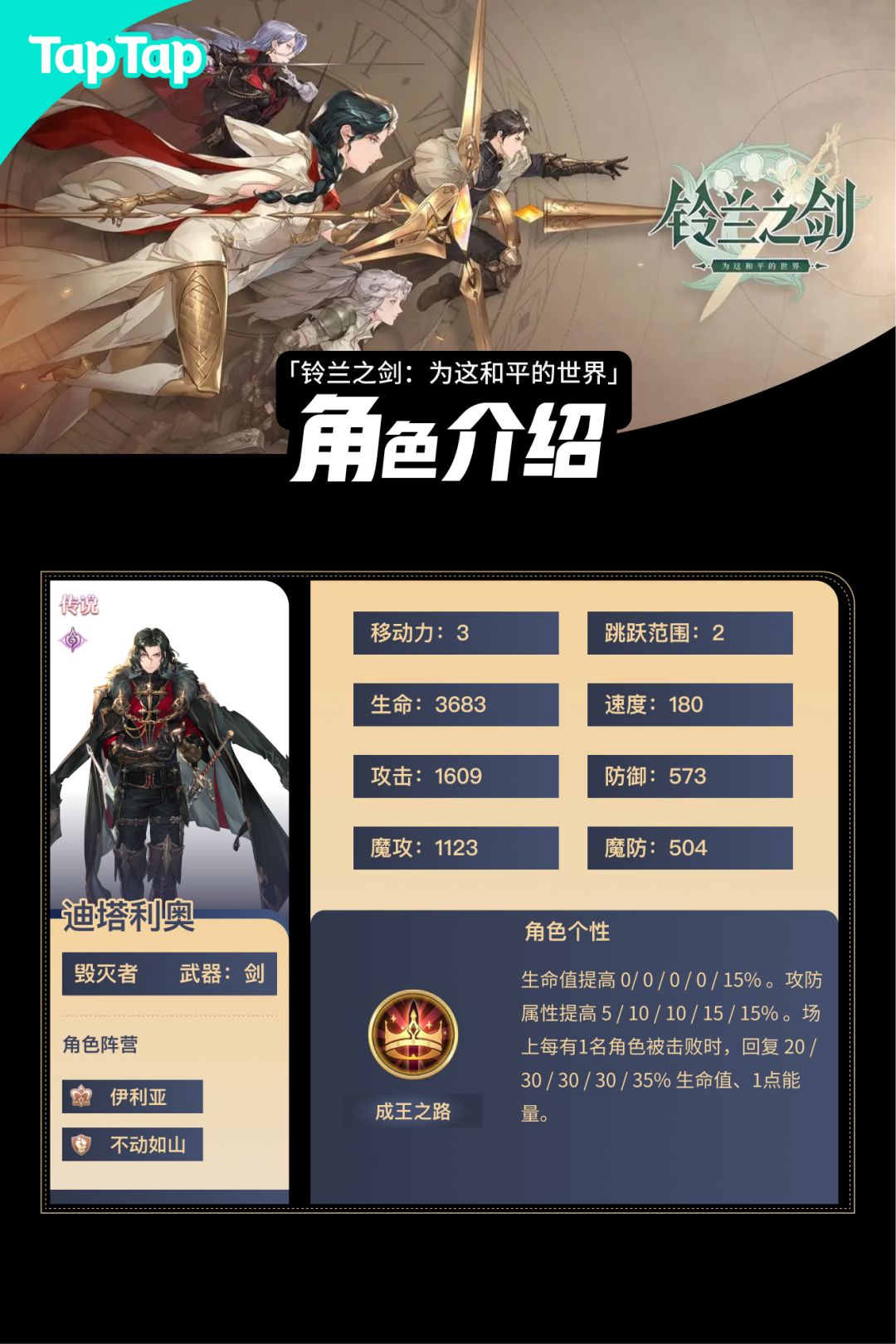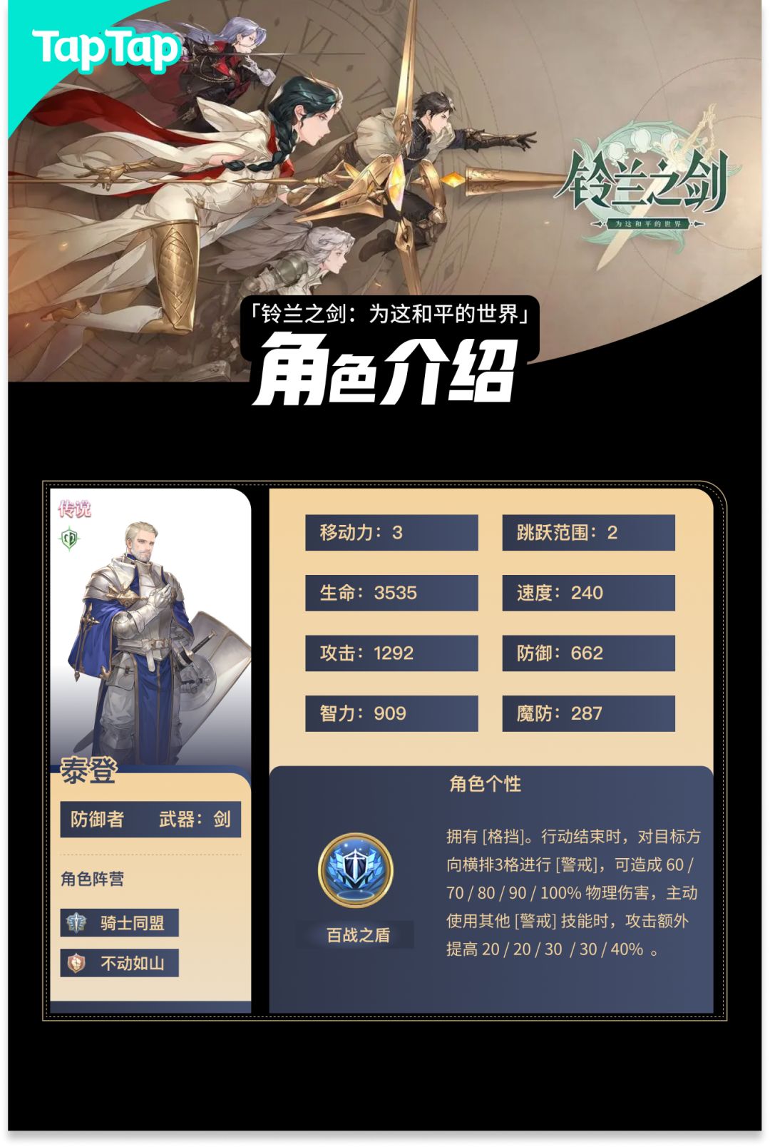 【角色介绍】 泰登是一名防御者,拥有高额的物理防御力。他手持巨盾,可以为队友提供保护,也可以警戒四周,干扰敌人进攻。 有泰登守护队伍,骑士们安心感满满! 【技能介绍】 【角色展示】#铃兰之剑公测#铃兰之剑