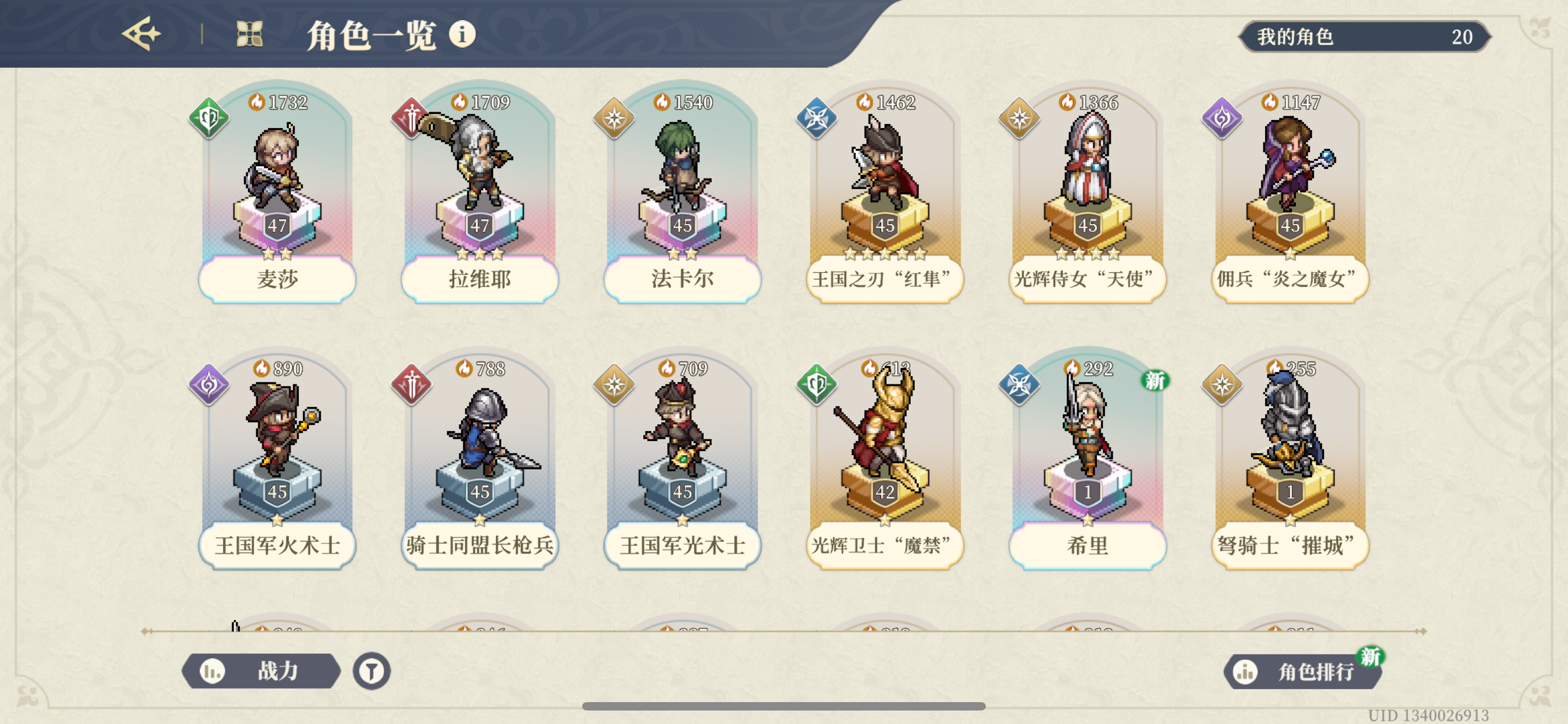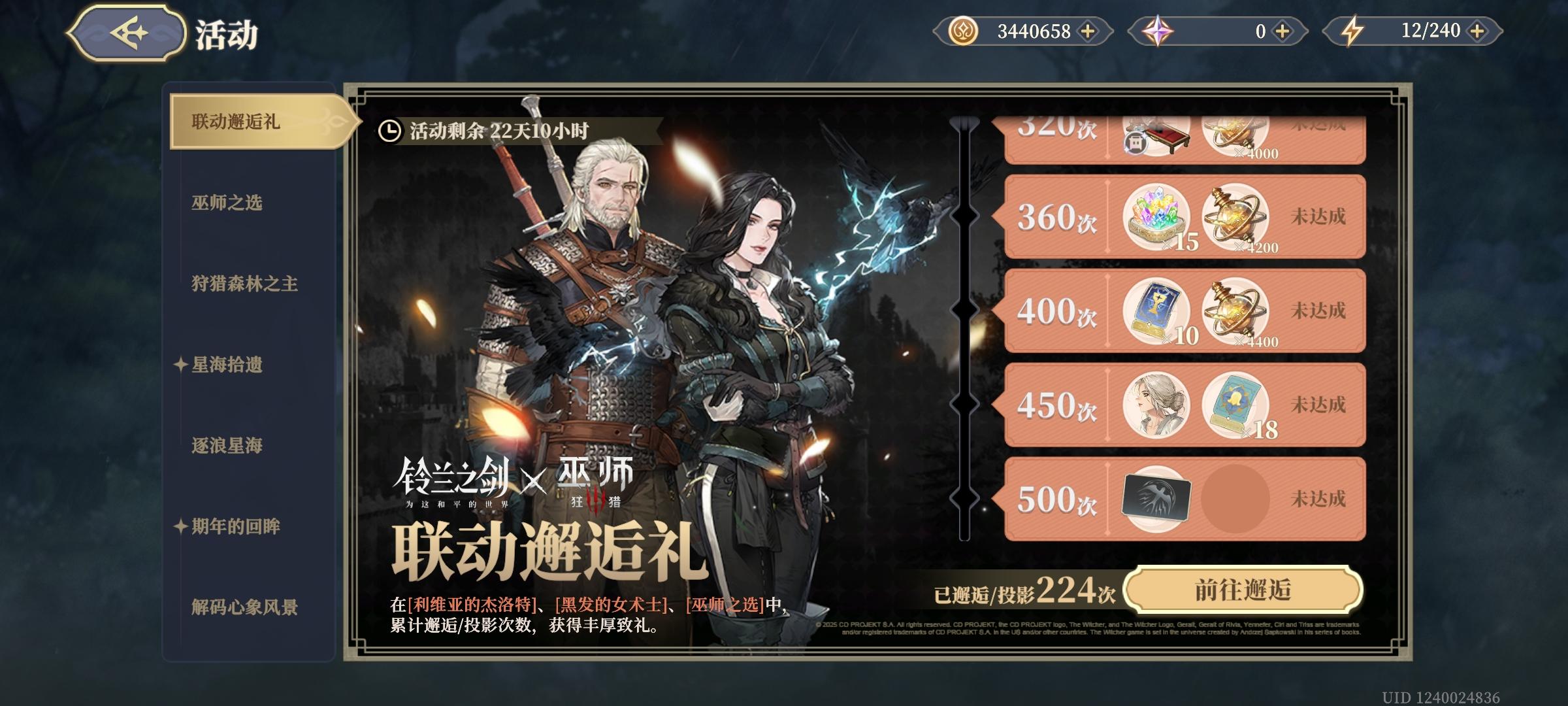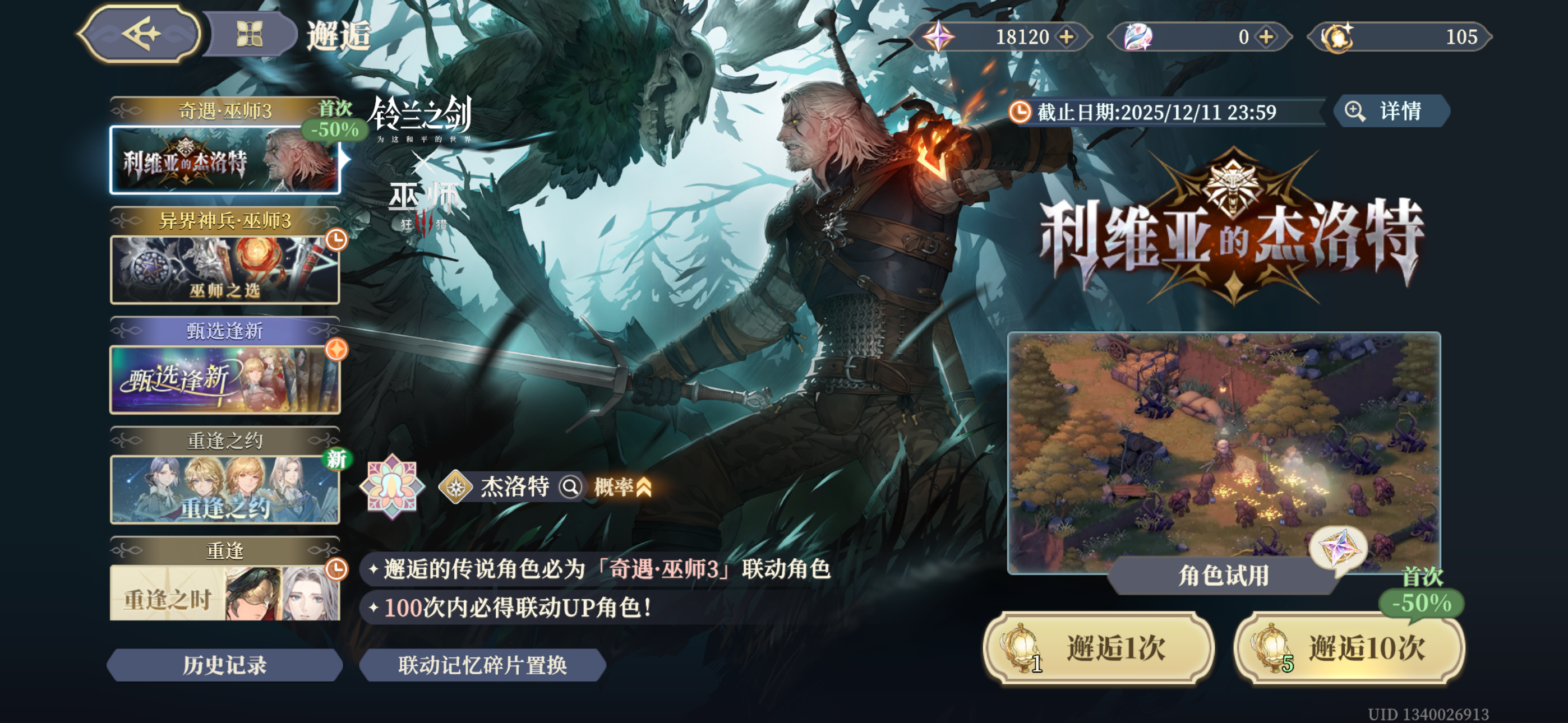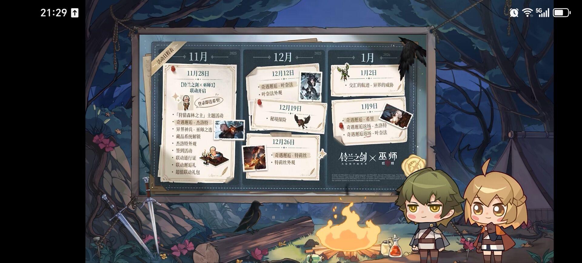 巫师3火焰纹章发烧友, 之前朋友推荐过铃兰之剑但是没有入坑, 这次巫师铃兰联动, 加上最近游戏荒, 决定试水一下铃兰之剑.经由入坑的朋友讲解, 犹豫了很久初始号和自抽号, 最后还是决定自建账号玩, 这样感觉比较有成就感, 本人小氪玩家, 氪别人账号总感觉有点微妙.铃兰对新手还是很友好的, 经过2天爆肝, 攒了200抽. 中间氪了30元小月卡, 丰收