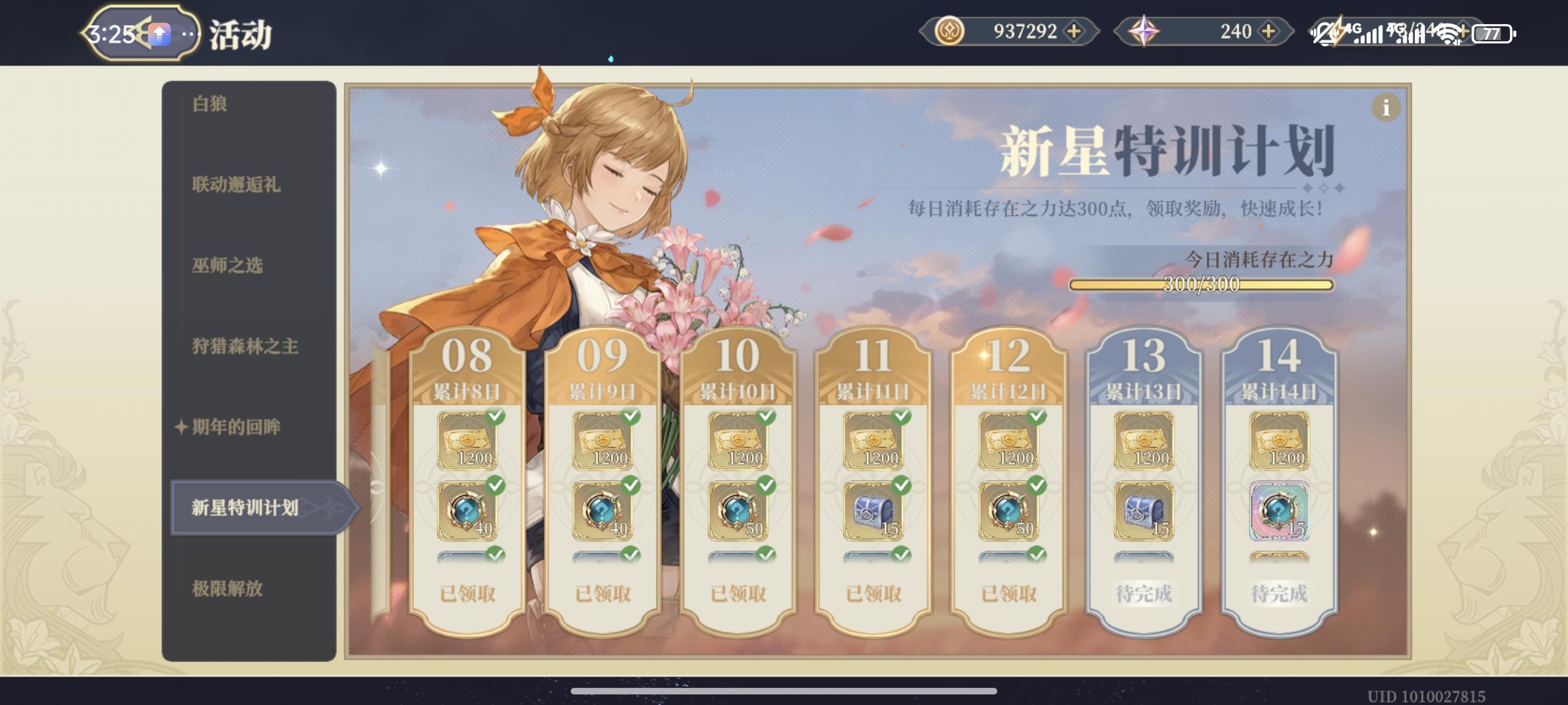 谨慎的萌新还在纠结冲不冲联动池子。重生的老登已经开始收菜了,12天新号过70神兵,杰洛特主C,天赋刚到黄金,神兵2和3这周可以打完。ps:上周过了65,70神兵3破不了盾,这周升了60武器开了刻印,全部拿下。我不是巫师粉,但杰洛特对新手确实很友好,杰的闪避单点,叶的镜像上易伤也能配合群体抗伤,希里的推推和伤害锁定都很好用。抽到杰和叶就停手。推关+攒抽等下个大版本。