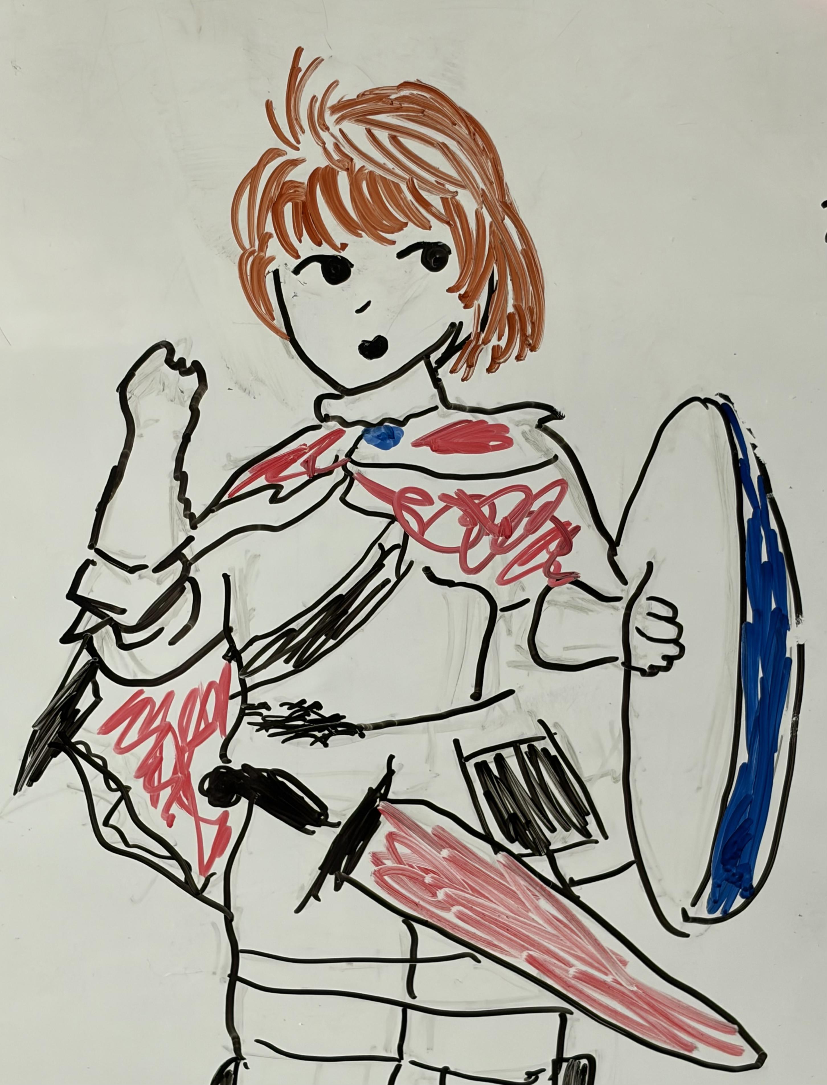 :爸爸你有艾莎公主嘛:艾莎为了保护伙伴死了,还有麦莎和萨曼莎:她们谁漂亮呀:麦莎吧,她长大了可以开机器人:那我先画她小时候吧