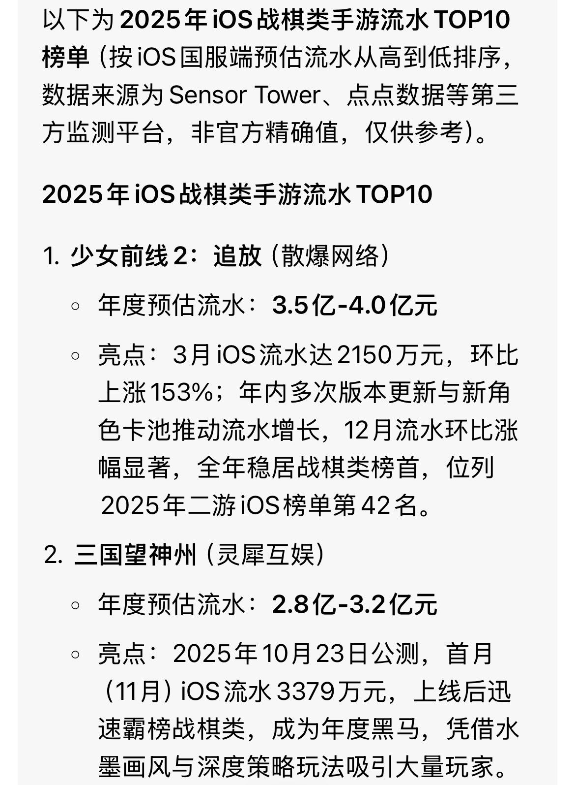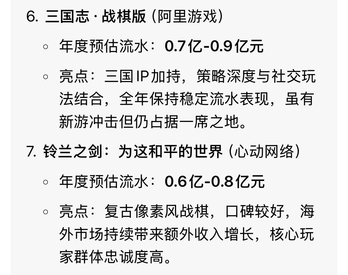 不过稳定在前10,其实还可以感觉爱好战棋类手游的,有大量当年PC单机三国曹操传老玩家,所以题材是三国有点优势。另外还有一部分是PC单机火焰之纹章的老玩家。刚过两周年,虽然没有爆发过,但2025年11月份其实铃兰之剑流水一度排在第一,按战棋手游规律是第三第四年爆发的,就看今年如何啦#铃兰之剑为这和平的世界