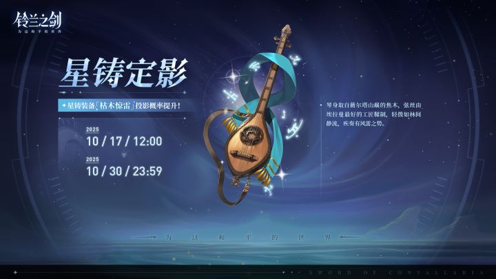 亲爱的团长:「星铸定影」限时投影将于 2025/10/17 12:00 - 2025/10/30 23:59 开启,全新星铸装备「枯木惊雷」投影获取概率将大幅提升!✦ 此投影属于「定影」,与同类型投影的保底机制共享。 ✦「枯木惊雷」会在后续加入「丰饶商店」与「装备商店」。🌠 枯木惊雷(装具)治疗时提高魔攻。对敌人治疗时魔攻额外提高,并回复能量。————————————琴身取自薇尔塔山