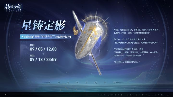 亲爱的团长:「星铸定影」限时投影将于 2025/09/05 12:00 - 2025/09/18 23:59 开启,全新星铸装备「骑枪“奋勇当先”」投影获取概率将大幅提升!✦ 此投影属于「定影」,与同类型投影的保底机制共享。 ✦「骑枪“奋勇当先”」会在后续加入「丰饶商店」与「装备商店」。🌠 骑枪“奋勇当先”(枪)生命值提高,施加[护盾效果]提高。释放[职业技能]获得[护盾]后,自身伤害提