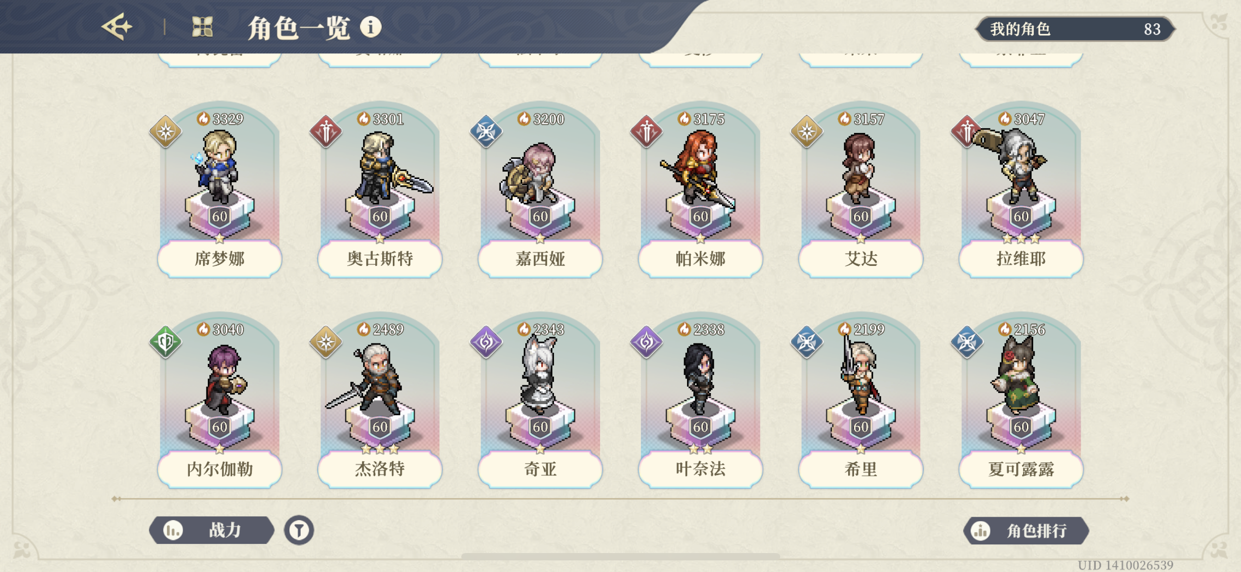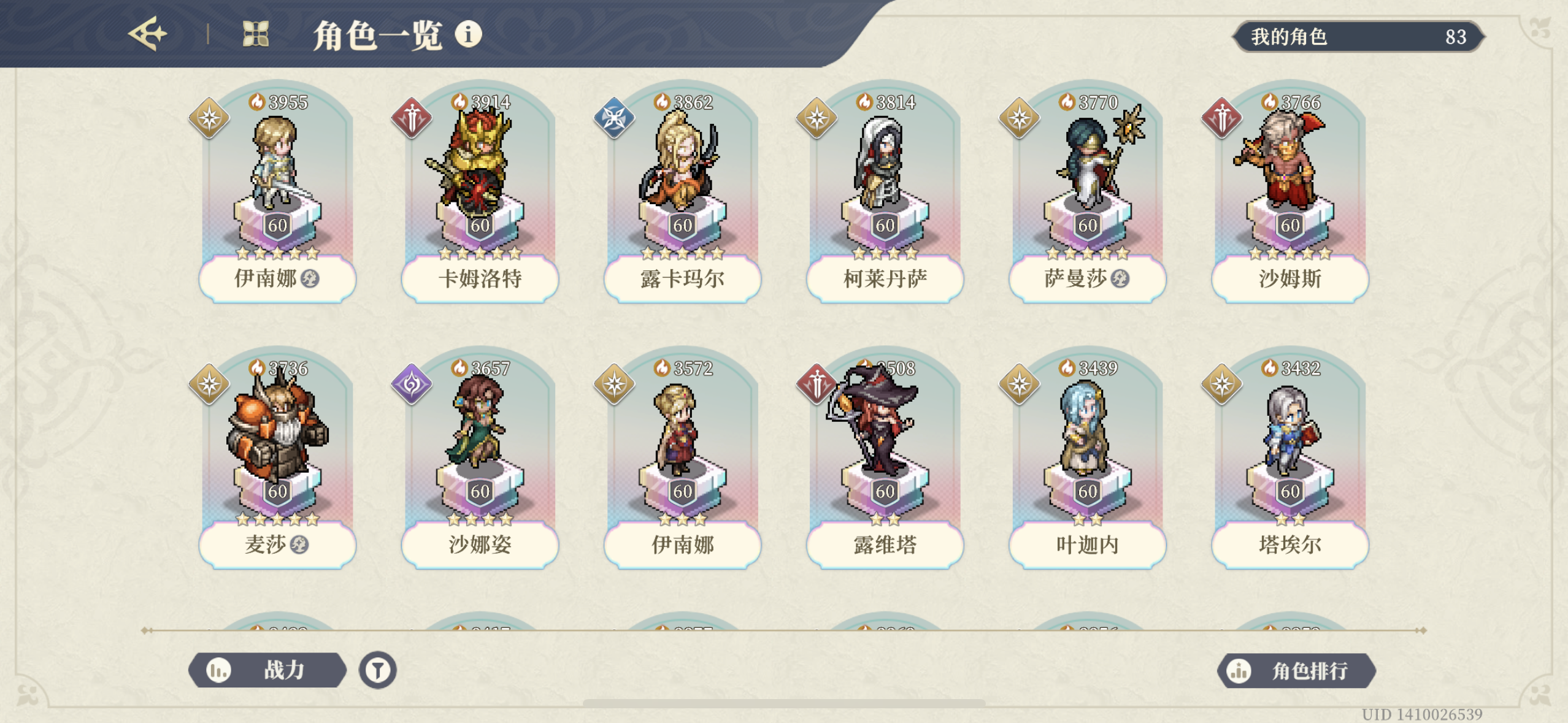 从10月20日开始30级的新号(主页可见),到今天60级通关,一步步的等级提升,装备培养,塔罗培养,天赋点选,真的很有成就感。也终于打完了目前铃兰所有常驻的最强挑战。 通关图: 特点强调,今天最后的力量认证9-10,用了最高攻击力2900,战力2500的主c角色就过了!(傲娇)⭐养成练度: 1.一个五星,最高战力3450,大部分为2000多战力。可以做个战力参考,让大家明