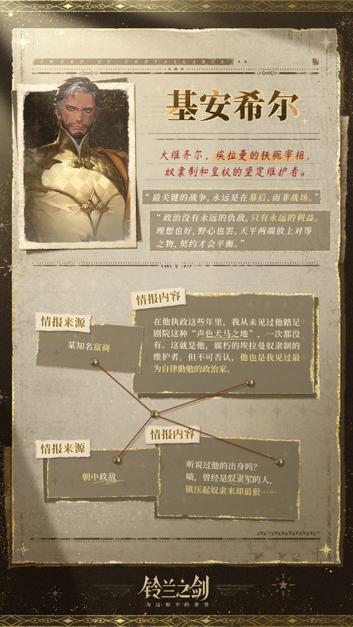 “大维齐尔基安希尔,埃拉曼的铁腕宰相,奴隶制和皇权的坚定维护者。”【姓名】基安希尔【性别】男【身份】埃拉曼大维齐尔✦ 官方公众号:铃兰之剑✦ 官网游戏下载:↓↓↓