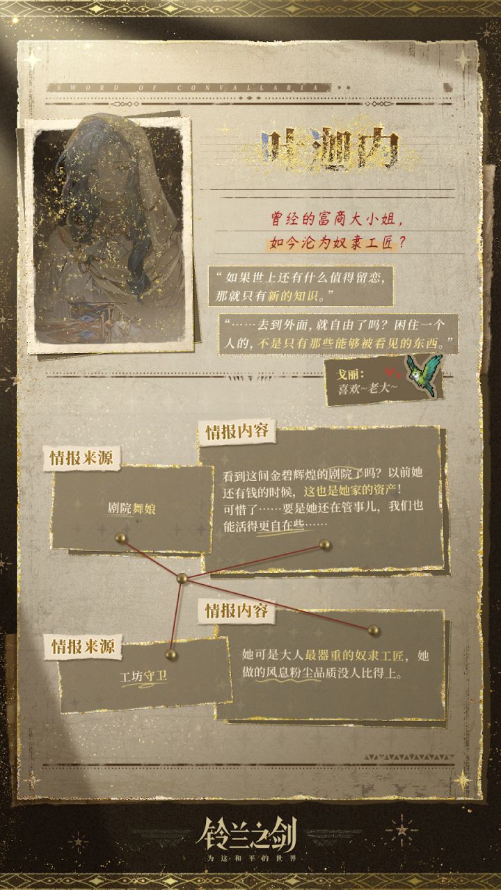 “老板我尽力了!这位的情报也太少了吧!”“我从黑市里淘了几本古书,上面好像有些碎片信息,你先看看?”【姓名】???【性别】?【身份】流亡骑士✦ 官方公众号:铃兰之剑✦ 官网游戏下载:↓↓↓