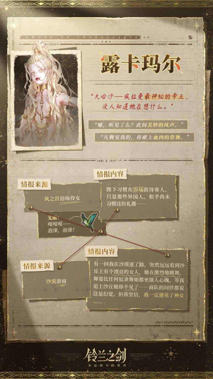 “老板!早就想带你来逛哈沙拉姆了,这回总算要实现了!哎呀正事正事,我知道!在你出发之前,我会持续为你收集情报的!”“唔,这位大哈沙,可能是埃拉曼史上最神秘的帝王,没人能看得懂她。老板,你可要当心啊!”【姓名】露卡玛尔【性别】女【身份】埃拉曼大哈沙✦ 官方公众号:铃兰之剑✦ 官网游戏下载:↓↓↓