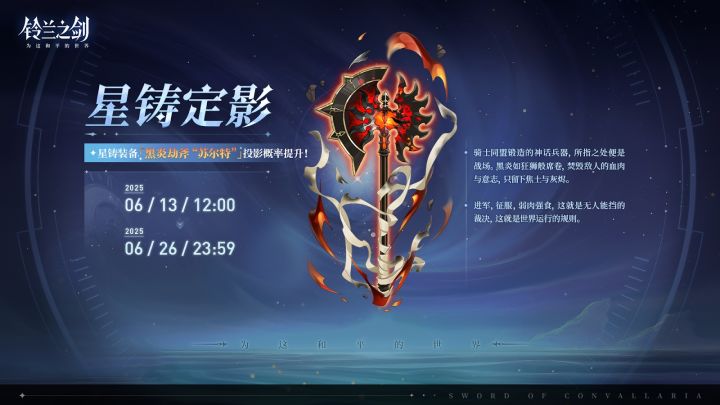 亲爱的团长:「星铸定影」限时投影将于 2025/06/13 12:00 - 2025/06/26 23:59 开启,全新星铸装备「黑炎劫斧“苏尔特”」投影获取概率将大幅提升!✦ 此投影属于「定影」,与同类型投影的保底机制共享。✦「黑炎劫斧“苏尔特”」会在后续加入「丰饶商店」与「装备商店」。🌠 黑炎劫斧“苏尔特”(斧)最大生命值提高,给予自身[物理护盾]时,攻击、物理范围伤害提高。———
