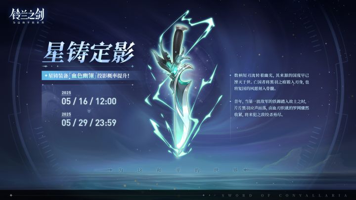 亲爱的团长:「星铸定影」限时投影将于 2025/05/16 12:00 - 2025/05/29 23:59 开启,全新星铸装备「血色幽翎」投影获取概率将大幅提升!✦ 此投影属于「定影」,与同类型投影的保底机制共享。 ✦「血色幽翎」会在后续加入「丰饶商店」与「装备商店」。🌠 血色幽翎(装具)每回合首次制造[物品]或[触发物]后,回复能量,提高攻防。————————————数柄短刃流转