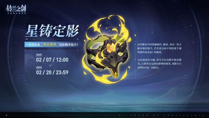 亲爱的团长:「星铸定影」限时投影将于 2025/02/07 12:00 - 2025/02/20 23:59 开启,全新星铸装备「敛息准玦」投影获取概率将大幅提升!✦ 此投影属于「定影」,与同类型投影的保底机制共享。 ✦「敛息准玦」会在后续加入「丰饶商店」与「装备商店」。🌠 敛息准玦(装具)物攻提高。主动「普攻」前物攻额外提高。————————————由坚硬冰冷的骨骼制作,据说,来自
