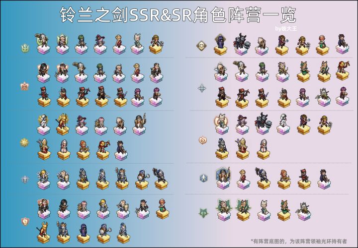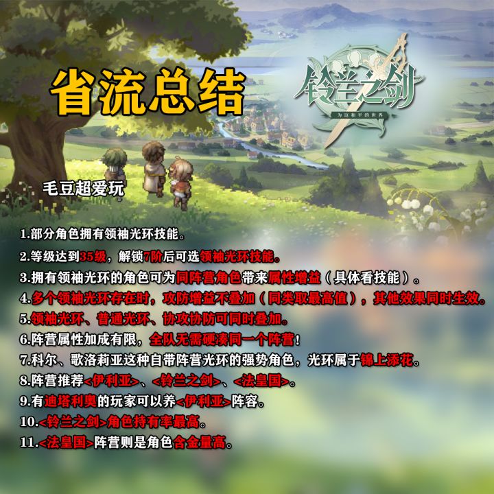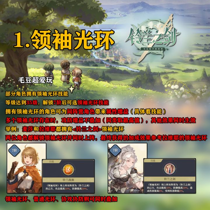 这里是毛豆,本期为大家带来的是《铃兰之剑-为这和平的世界》萌新指南,本期包含光环的小知识,角色阵营分布、阵营的推荐等,希望能帮萌新少走弯路,话不多说速速开启本篇攻略吧! 前排提示:省流版看最后一图1.部分角色拥有领袖光环技能。2.等级达到35级,解锁7阶后可选领袖光环技能。3.拥有领袖光环的角色可为同阵营角色带来属性增益(具体看技能)。4.多个领袖光环存在时,攻防增益不叠加(同类取最高