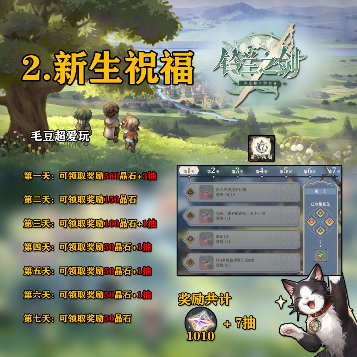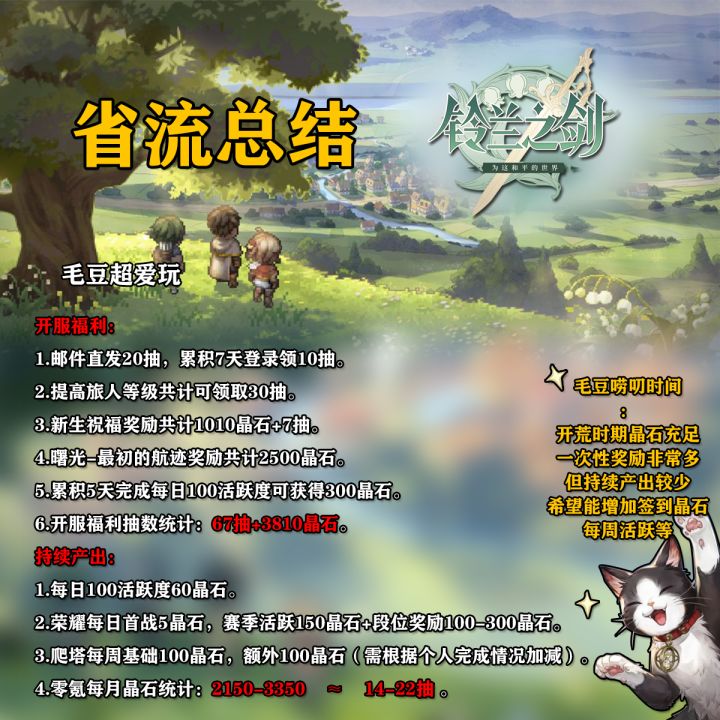 这里是毛豆,本期为大家带来的是《铃兰之剑-为这和平的世界》抽数统计,本期包含开服福利汇总,以及持续产出的晶石计算,话不多说速速开启本篇攻略吧!前排提示:省流版看最后一图开服福利:1.邮件直发20抽,累积7天登录领10抽。2.提高旅人等级共计可领取30抽。3.新生祝福奖励共计1010晶石+7抽。4.曙光-最初的航迹奖励共计2500晶石。5.累积5天完成每日100活跃度可获得300晶石。