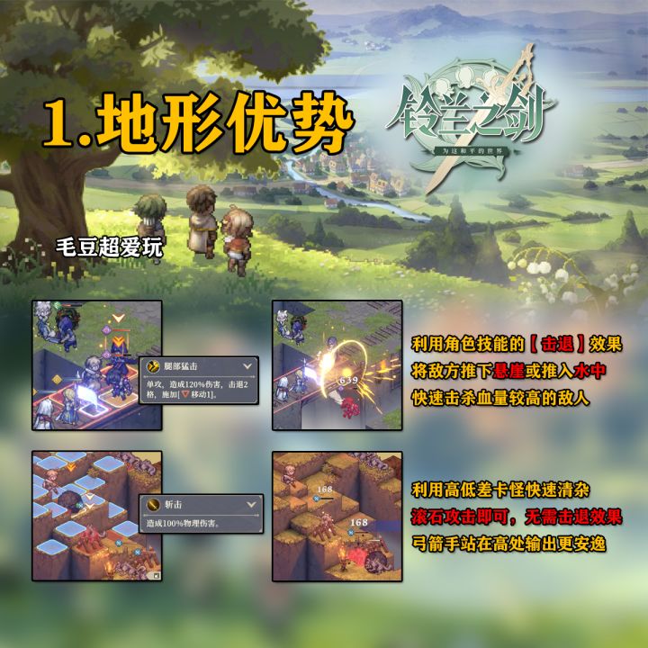 这里是毛豆,本期为大家带来的是《铃兰之剑-为这和平的世界》萌新指南,本期包含主线推图相关的一些小技巧,利用地形、道具、调整初始站位等,希望能帮萌新少走弯路,话不多说速速开启本篇攻略吧!前排提示:省流版看最后一图01.地形优势。麦莎的【击退】能力能在开荒阶段发挥奇效,利用悬崖地形杀,或者利用山路卡怪击落滚石,都是快速推图的好方法。02.炸药桶/滚石。对【炸药桶】造成伤害会使其爆炸,对1圈范