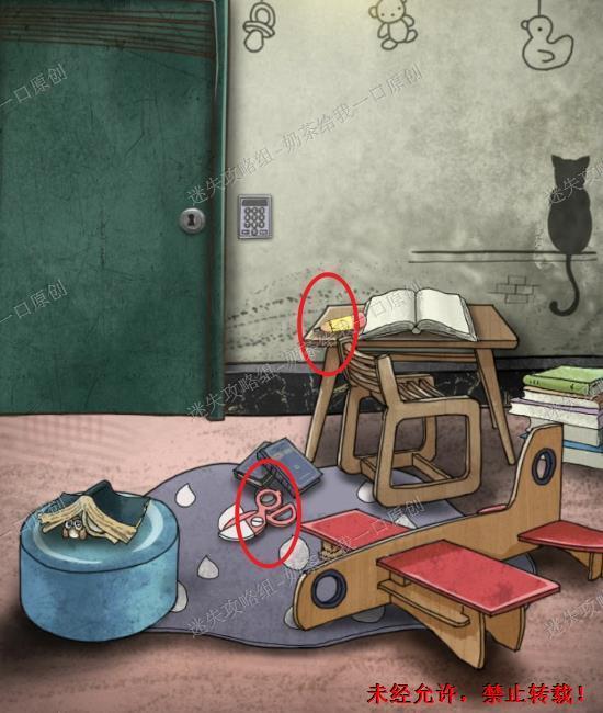 攻略组攻略优化更新,希望大家继续提意见给我们,攻略组会继续加油的!🍒第一关攻略🍒1、首先来到第一关,点击拿走地面上的剪刀还有木桌子上的铅笔。1.12、使用物品栏里面的剪刀将沙发剪开。点击里面的纸张,发现是空白的。2.12.23、对该纸张使用铅笔,之后会出现如图所示位置的数字,为6917。3.13.24、检查大门右边的门锁,根据刚才纸张上面出现的数字,如图所示输入密码6917。4.14.2