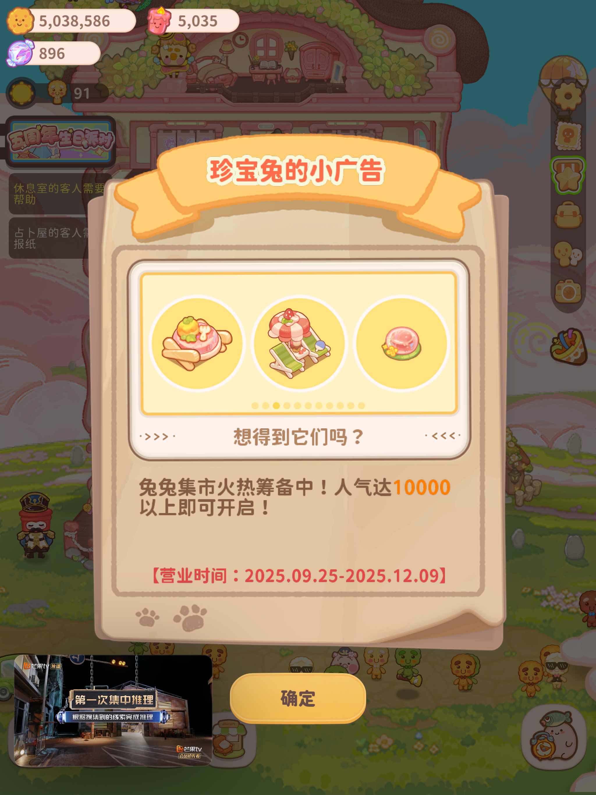 ①25次派对(6.8.0后改的) 由于新玩法是开12个小时冷却12个小时,只要保证每天办1个派对,25天即可完成 ②40次排片(6.9.0改的) 选择8小时排片,一天排片3次,14天完成 ③22次签约代言人 72小时更新一次,一次算2个代言人 需要22×3÷2=33天完成 ④招揽5000次客人 小方广告,老奶奶券,唱歌精灵券用起来(不想用券的话,每天早上艾咪有20分钟的揽客时间) ⑤挖掘泰坦厨艺1