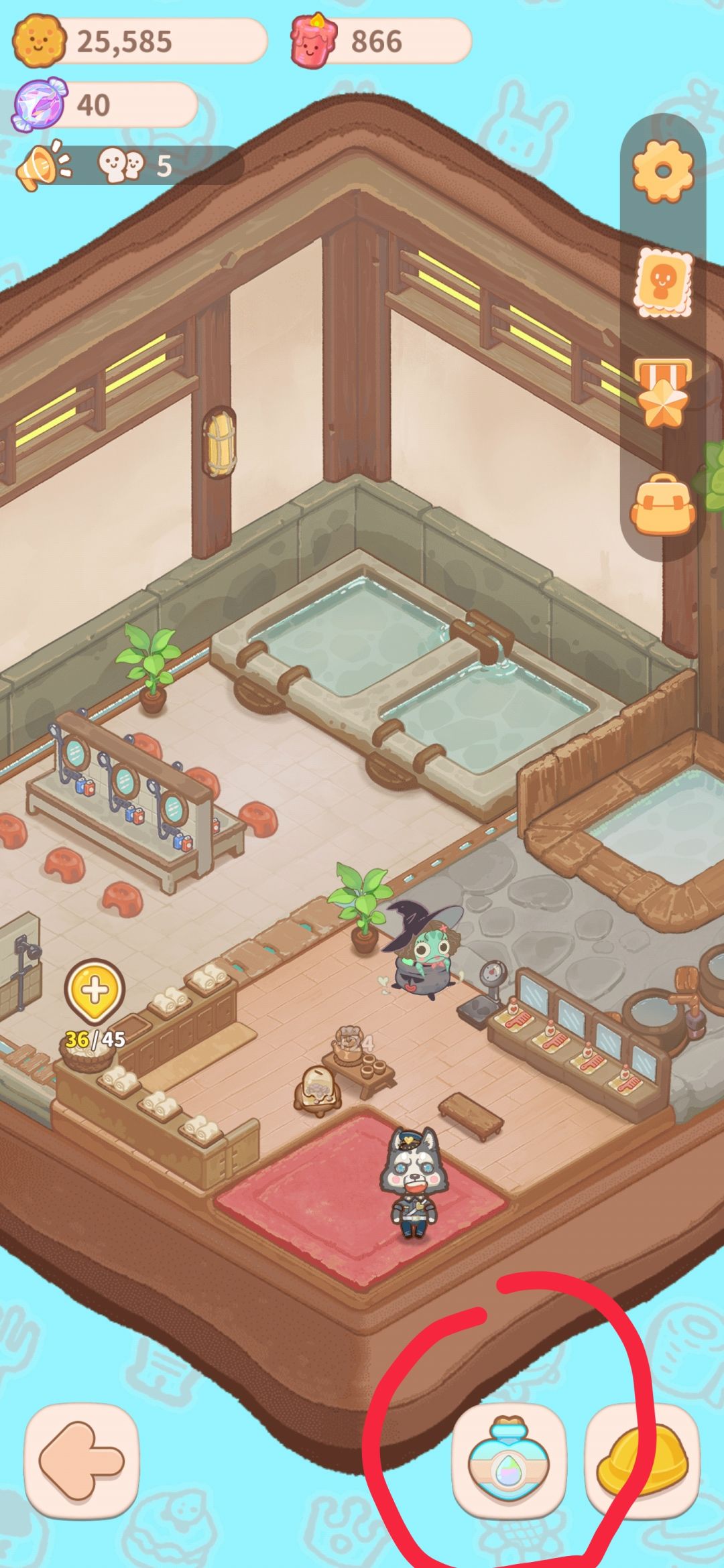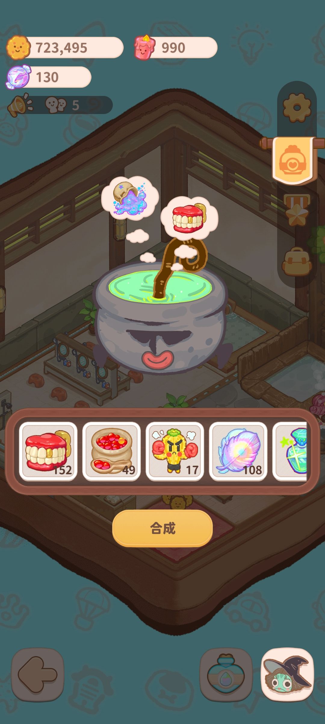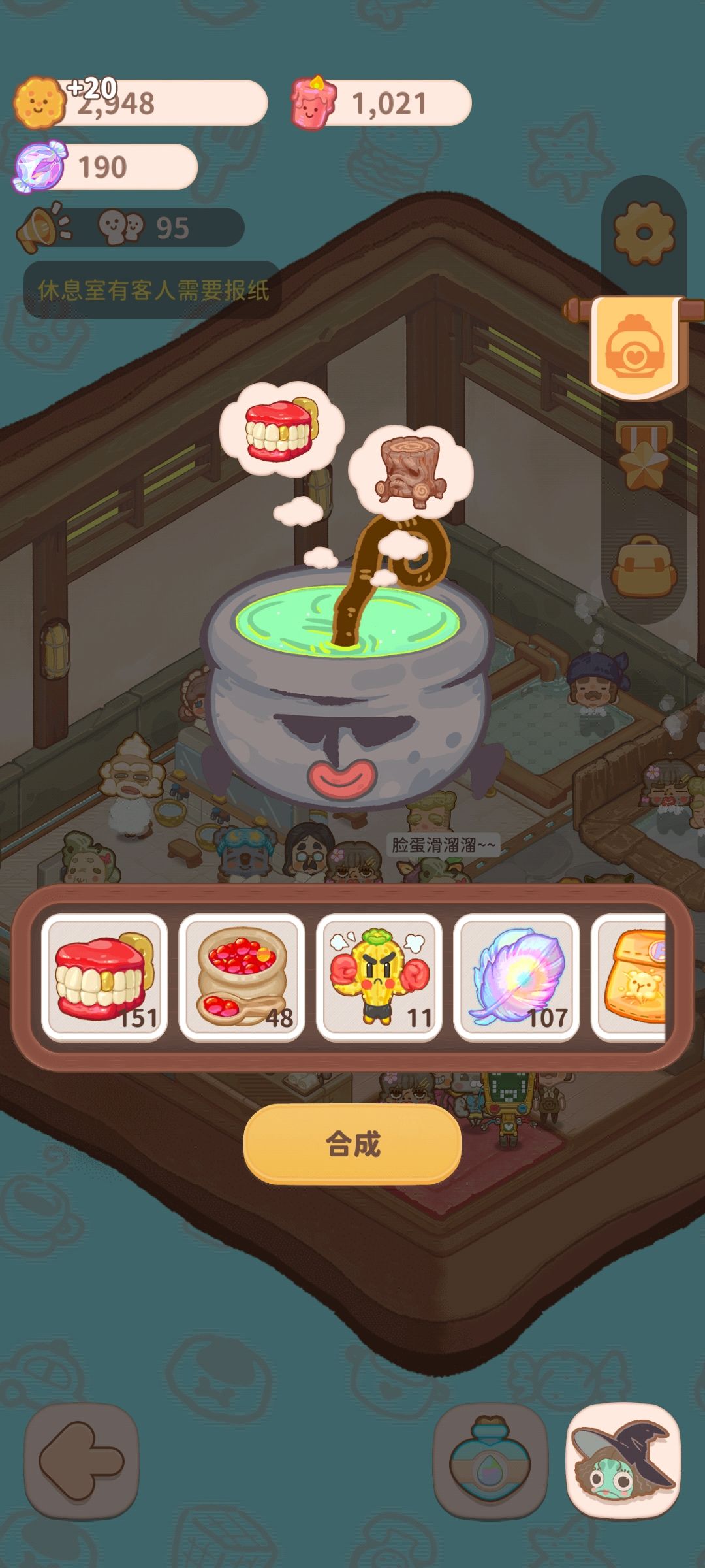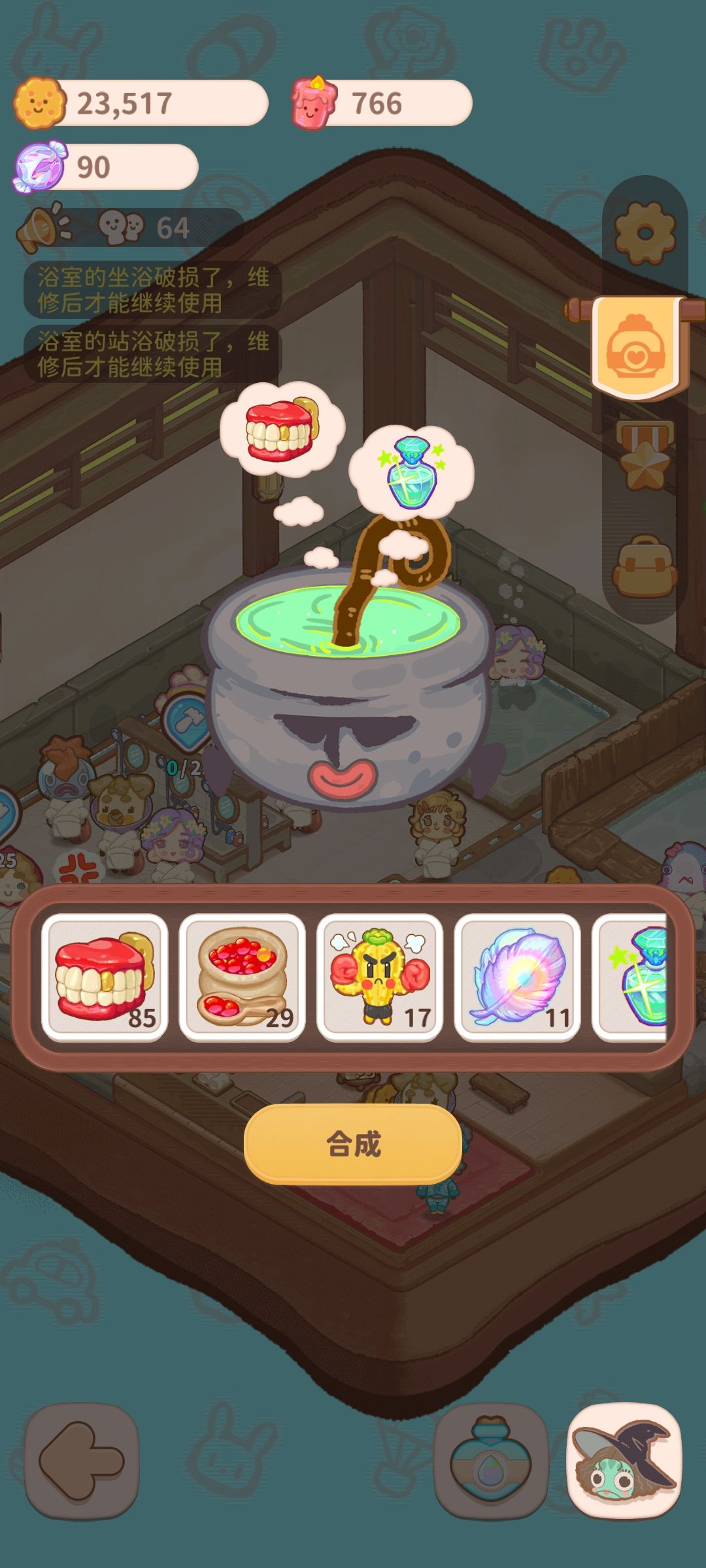 点开右下角的瓶子可以进入升级页面 在这里解锁鱼子酱 解锁鱼子酱需要下图这个蓝色幽灵塑料袋,可以按下面的配方制作 解锁玩鱼子酱之后,按锅里的+号可以进入商店 在商店里买完鱼子酱等材料后,按下图配方,就可以解锁最开始的两个特殊汤料 加汤料摁温泉里的+就可以