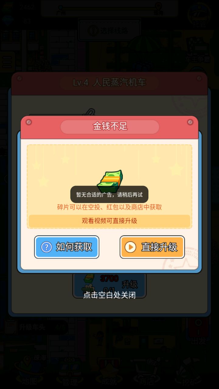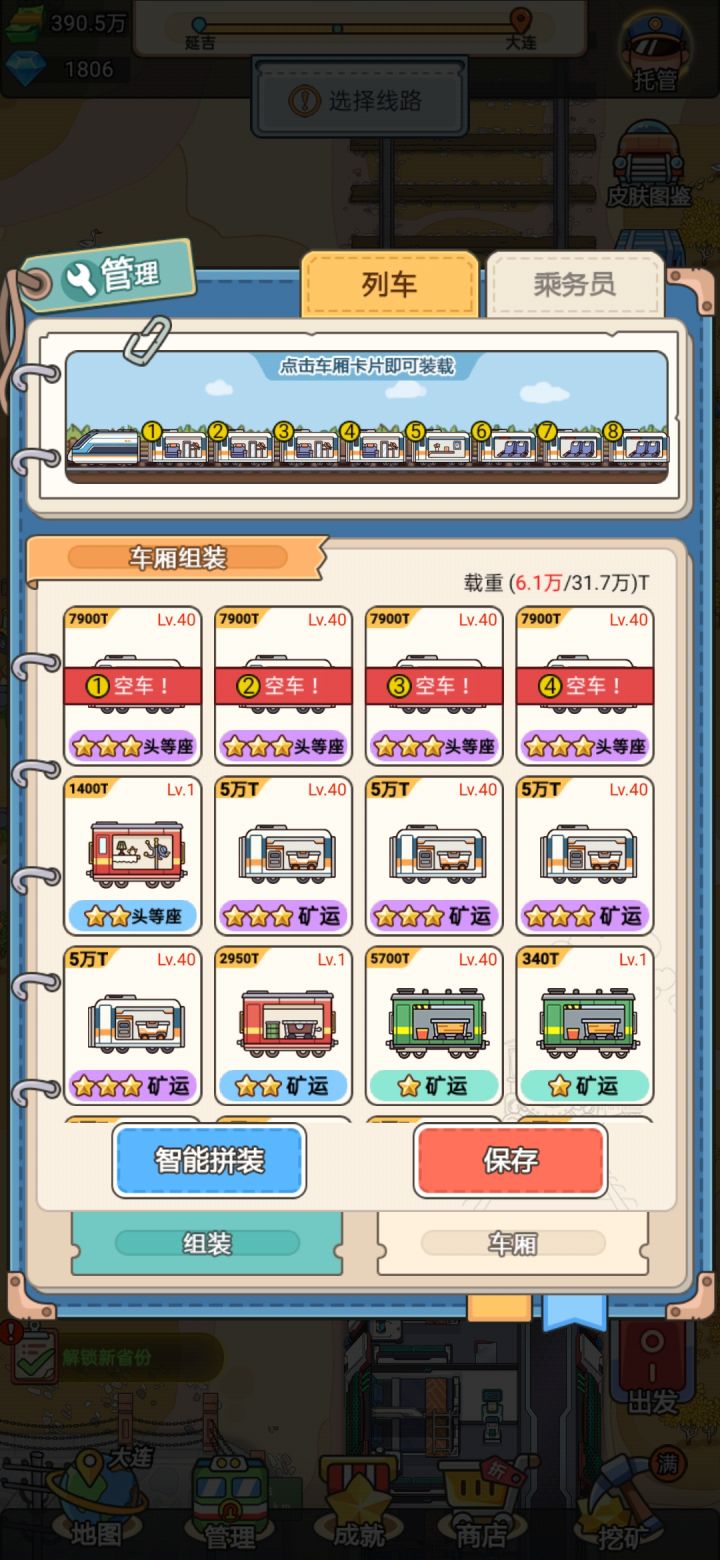 公测那天晚上下的,有时间玩一下,或半个小时左右上去领一下挂机收入(半个小时一次,一天十次也有一千多万资金了,视个人时间)!就三点一:除了自动托管其它可以不看广告!二:跑市场就主升车头,辅升货和矿车!三:拉人就主升客车,有多余的钱就升车头!个人感受:车厢不用最求满等级,货矿32级出六个仓位就行,头等6人,软卧8个,硬座18个就行了。再升级就是浪费钱!车厢升⭐️:一星车厢和三星车厢升级所需
