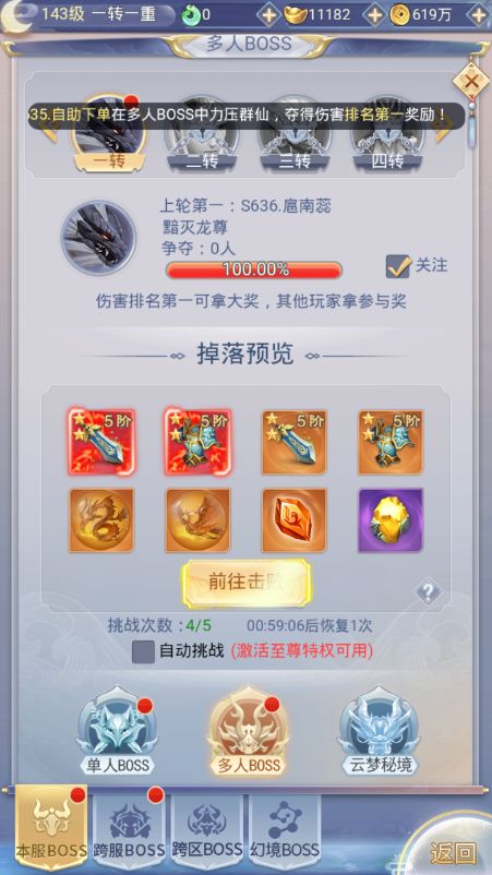 每天可以有5次机会调整boss,挑战次数会随着时间缓慢回复,一个小时恢复一次挑战机会,对boss输出伤害最高可获得MVP宝箱,其他玩家可获得参与奖励,给与boss最后一击的玩家可获得最后一击的宝箱奖励(抢boss奖励)!