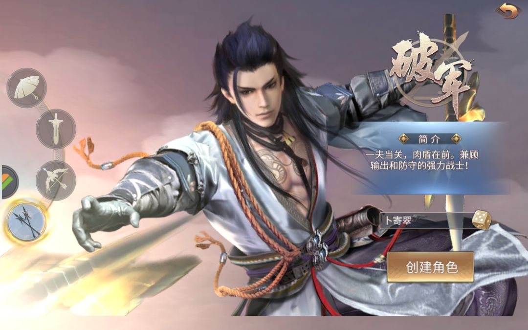近战攻击,手持长枪,身着重铠,兼顾防守,总是冲在战场前线,守时固若金汤,攻时势如破竹。战场上进则战群雄,退则护队友,能攻能守能进能退。上手简单操作易懂,团队中必不可少的重要角色。 下面让我们一起来看下《御剑仙缘》中破军这一人物的技能: 破军普攻 技能效果:想前方快速挥砍,连续挥砍三次后可镶嵌发起斩击 破军横扫 技能效果:对目标造成4次20%基础伤害+15伤害 野蛮重击 技能效果:对目标造成65%基