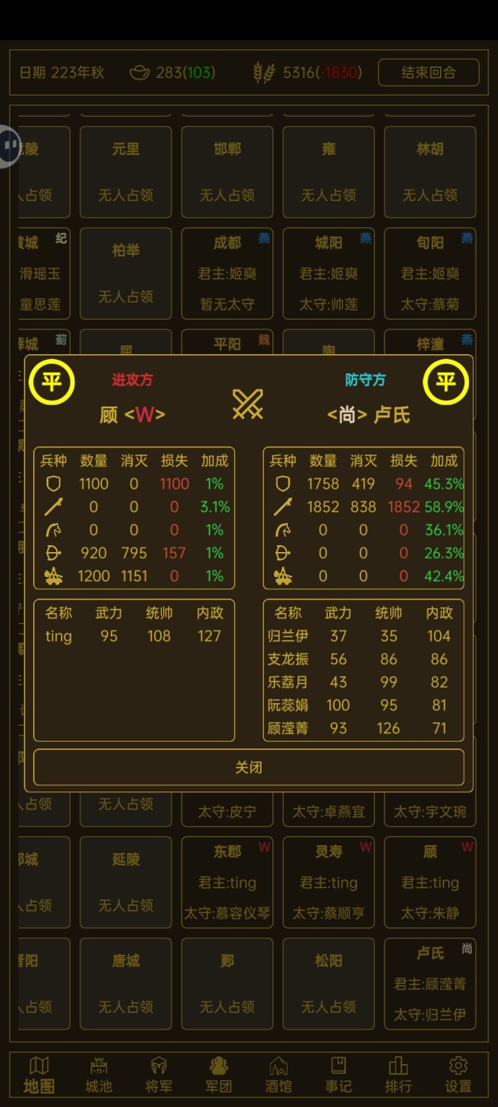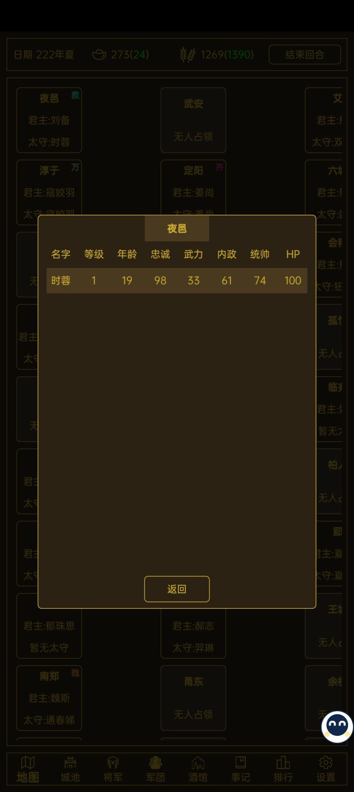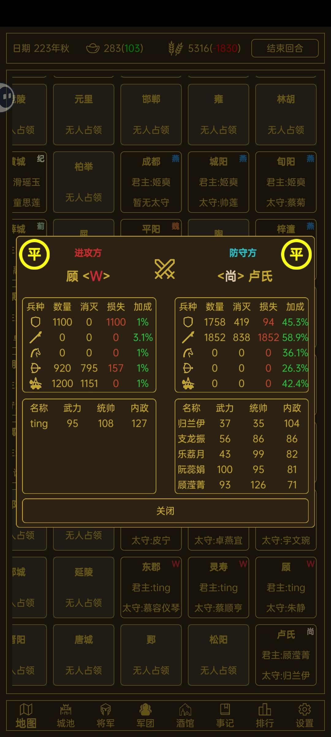 我把主将移动到隔壁城市,然后隔月隔壁城市叛乱,我的主公就没了,问题是显示主公还是原来的那个主公,但武将开局就没了。以下附图,就在城市就在左上角的城池坐标