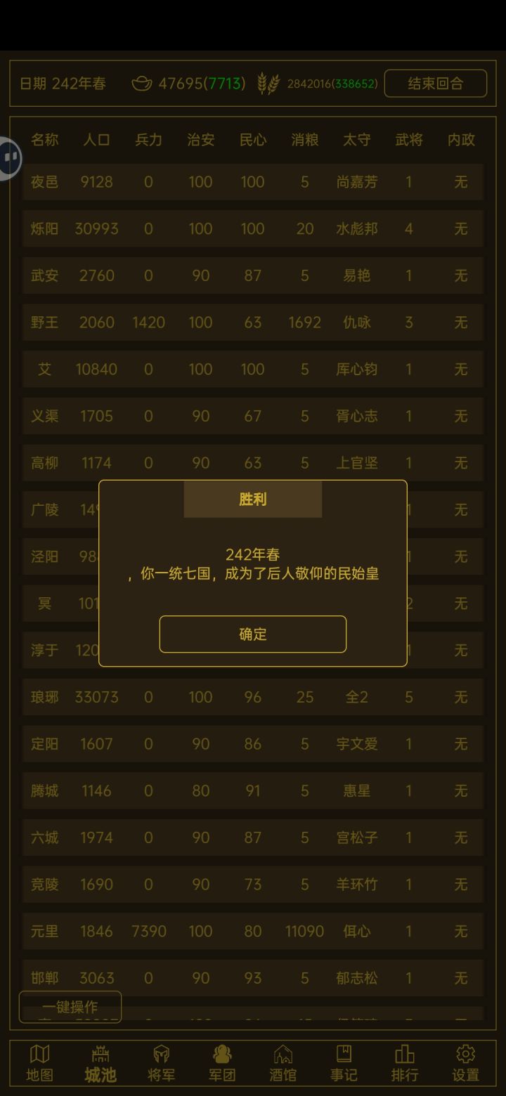 中期:民心大于84征收,小于84开发,很快搞到了白银。白银多了之后给邻国,结盟,人机不会打。招将,买兵,装备最好全装高装,打小国。