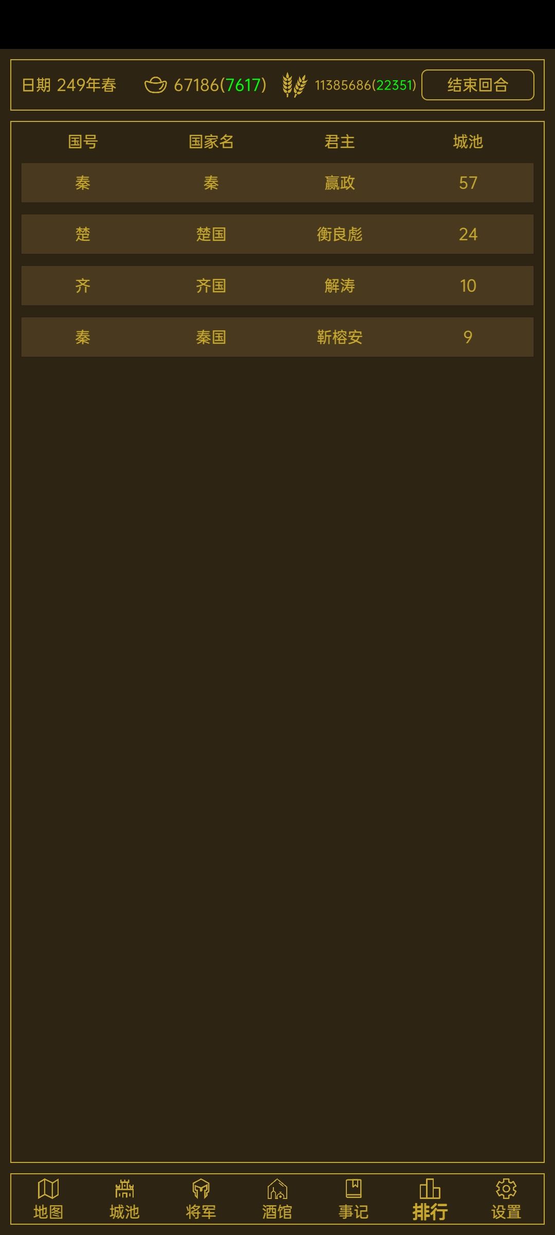 首先随机首先随机到一个离七国非常远的地方,之后把周围的城池打下来,尽量离原始七国有一定距离,之后安心发展,如果哪个国家到发展到你边了,用金钱提升好感度之后结盟,之后再安心发展一段时间,如果有其他国家到你旁边,你直接花钱和他结盟,等你每个城市人口都发展到一万多,直接抽一半人口,组成军队,最好各种兵士都有,之后如你如果还有钱的话,多抽名将,之后多抽装备,在发展城市中,能选择发展就发展,万不得已也可以用