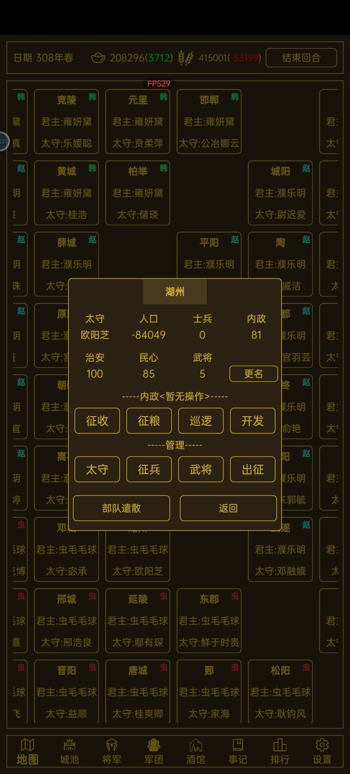 核心技术是理财,将用50银抽的,能将就用,人口城就不要养了。满一千就征走补充到大部队,民心80以上就征收,粮食永远不够的,君主最好刷个高内政的不要动。粮食负增长武将每回合-5hp。