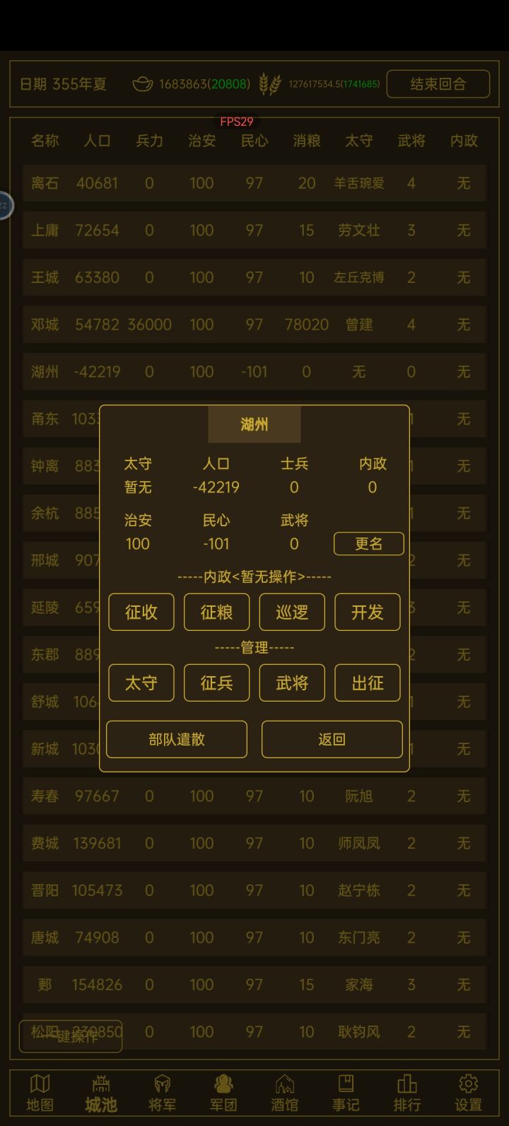 我不知道为什么,人口成负的了,然后我尝试降民心让他起义,结果民心也成负的了,接着我又分了个军团给他,结果都成负的了