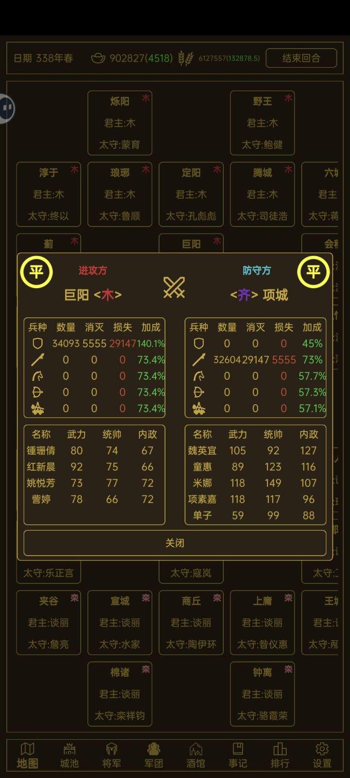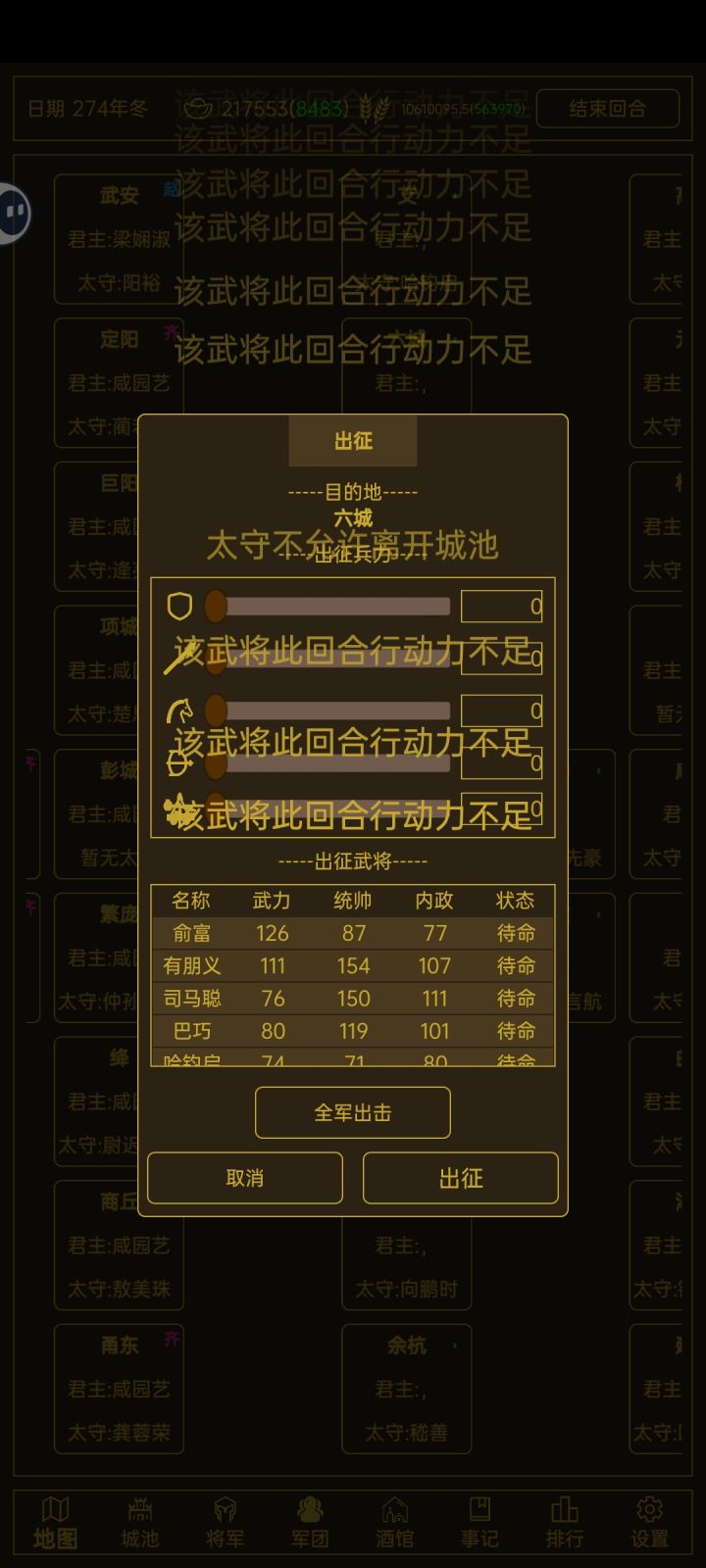 核心技术是理财,将用50银抽的,能将就用,人口城就不要养了。满一千就征走补充到大部队,民心80以上就征收,粮食永远不够的,君主最好刷个高内政的不要动。粮食负增长武将每回合-5hp。