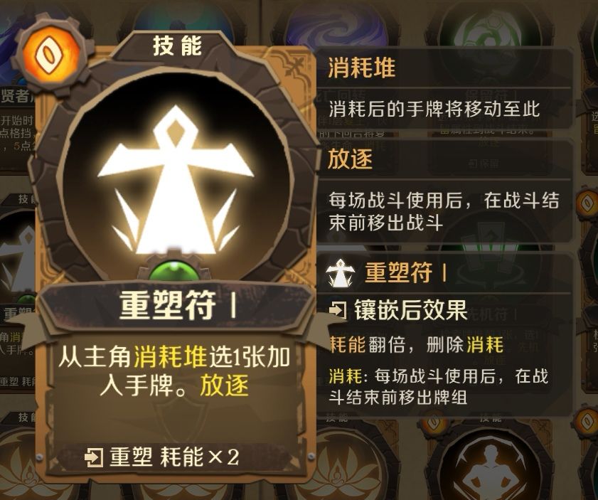 组成 阵容:随意; 卡牌:符文牌『重塑符』任意品质,技能牌『启示』镶嵌符文牌『消耗符 Ⅲ』。 套路打法:当『重塑符』在手牌中且『启示』已被消耗时,可以进入循环了——使用『重塑符』⇨获得『启示』,使用『启示』力量+3⇨获得『重塑符』…… 进阶:1.要想套路够流畅的话全程尽量只删替牌别增加牌组数,不用其他带消耗的牌就不用在消耗牌堆里找『启示』了; 2.循环的两张牌均为技能牌,与通过技能触发的能