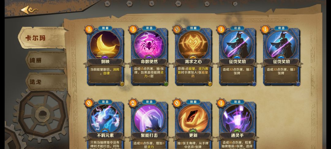 巫师三个角色,主观的说,丹尼尔太难了,失败好多次,最后用的是检索+2灵力,专属卡带的0费检索5张格挡10点,难度30奖励用的加强基础卡,60奖励选的二三层阵营奖励(我都选的塔拉玛公会替换基础攻防卡,二层换2张,三层换3张),卡牌依旧拿的很杂,换卡要钱,一层都是直接拿卡,二三层看情况换或者放弃,,前期过渡看手牌情况,攻击防御缺什么拿什么,打过第一层保持好血量,招募伙伴。 最后说一下,巫师3费能力卡,