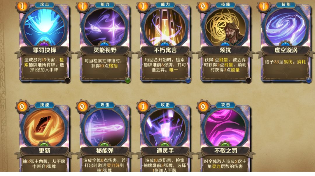 核心卡: 更新(抽二弃一) 秘能弹(打出完成灵力阵摸一张) 烦扰(使用回一,弃置回二,消耗回三) 通招手(检索卡组前三张拿一张) 玩法就是保证弃牌堆和摸牌堆就这几张卡,先后顺序是 先检索攻击牌 (拿更新在手里随便拿) 然后更新(弃置烦扰) 最后打出秘能弹(因为刚好打出灵力阵可以把弃牌堆的卡抽出来)有时候会鬼抽把更新和通招手沉底所以需要本体卡检测把更新拿上来。因为有些怪有使用牌次数限制,反伤