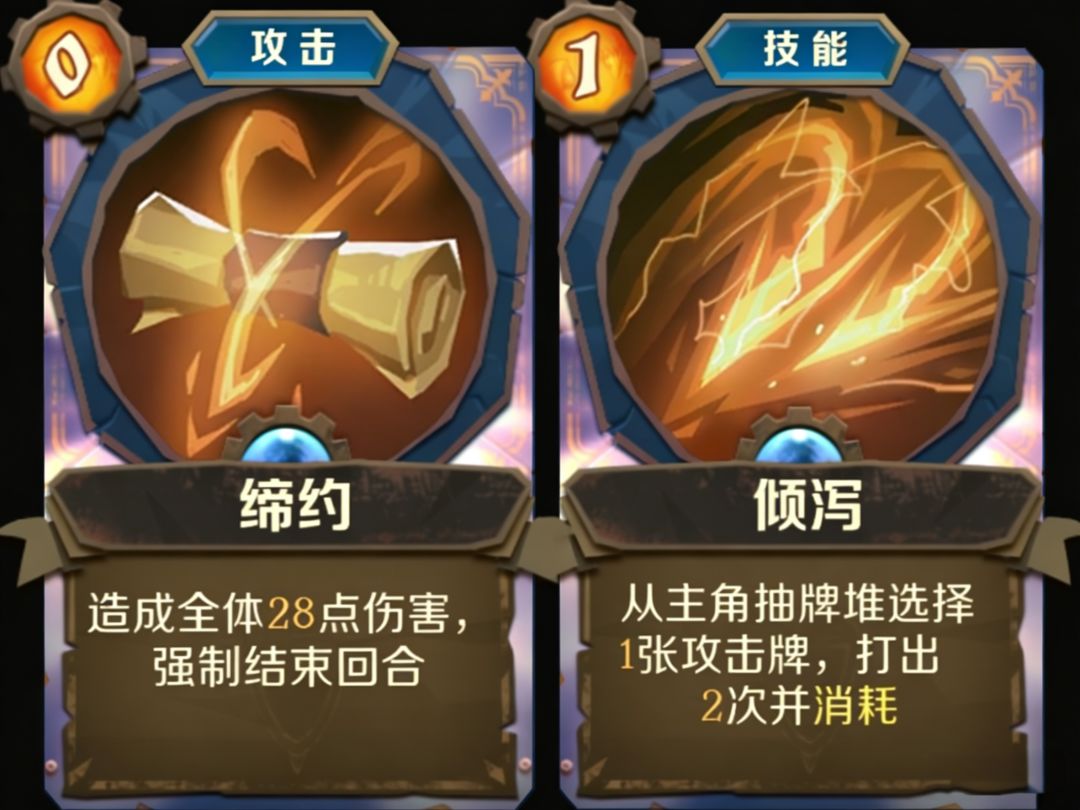 倾泻的效果是触发了两次攻击卡 缔约是造成伤害,并且结束回合 倾泻打出缔约,可以触发两次回合结束的效果(视频中触发了,卡尔玛的减费、能力卡“固能”以及伤害天赋) “打出”果然是因狄斯最强词条