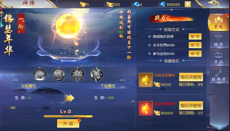 1. 神饰 玩家可以在神饰界面查看到自己的神饰基础属性和进阶,进阶到一定等级会解锁下一个形象,神饰分为灵珠、腰饰、手环、麒麟臂四种。 2. 神饰-灵珠 玩家可以在这个界面查看自己已经激活的灵珠以及属性,升级到一定阶段可解锁下一阶形象和强力技能 3. 神饰-腰饰 玩家可以在这个界面查看自己已经激活的腰饰以及属性,升级到一定阶段可解锁下一阶形象和强力技能 4. 神饰-手环 玩家可以在这个界面查看自己已